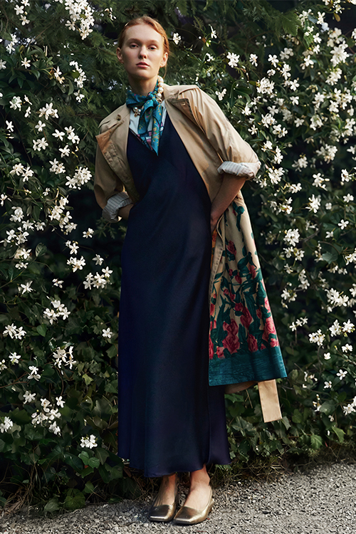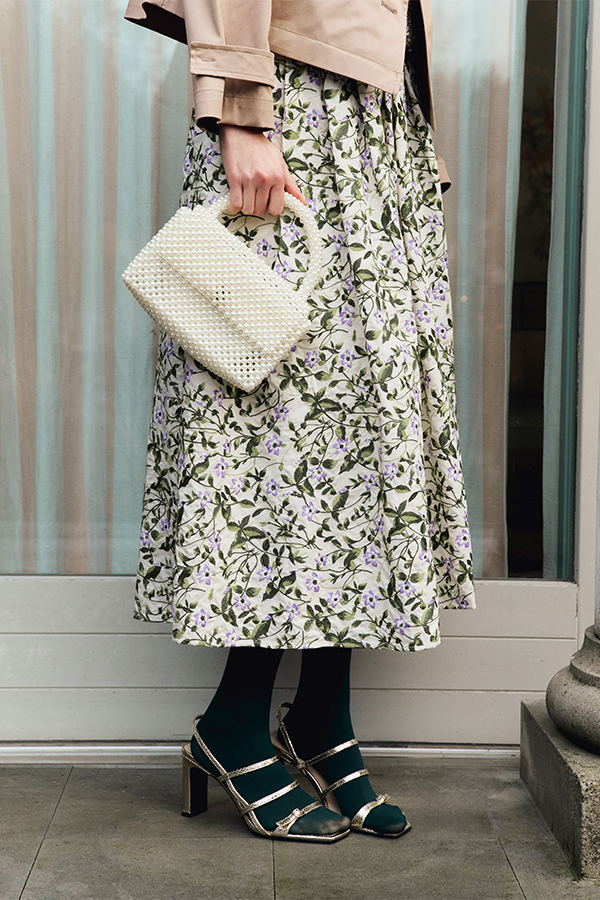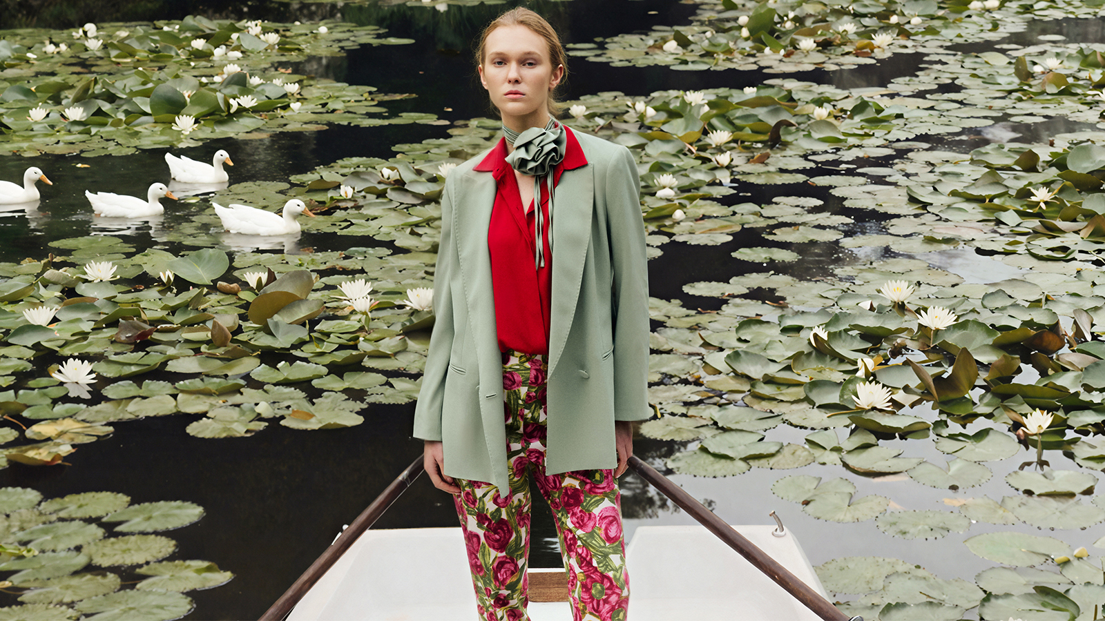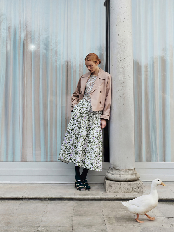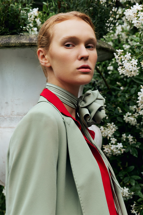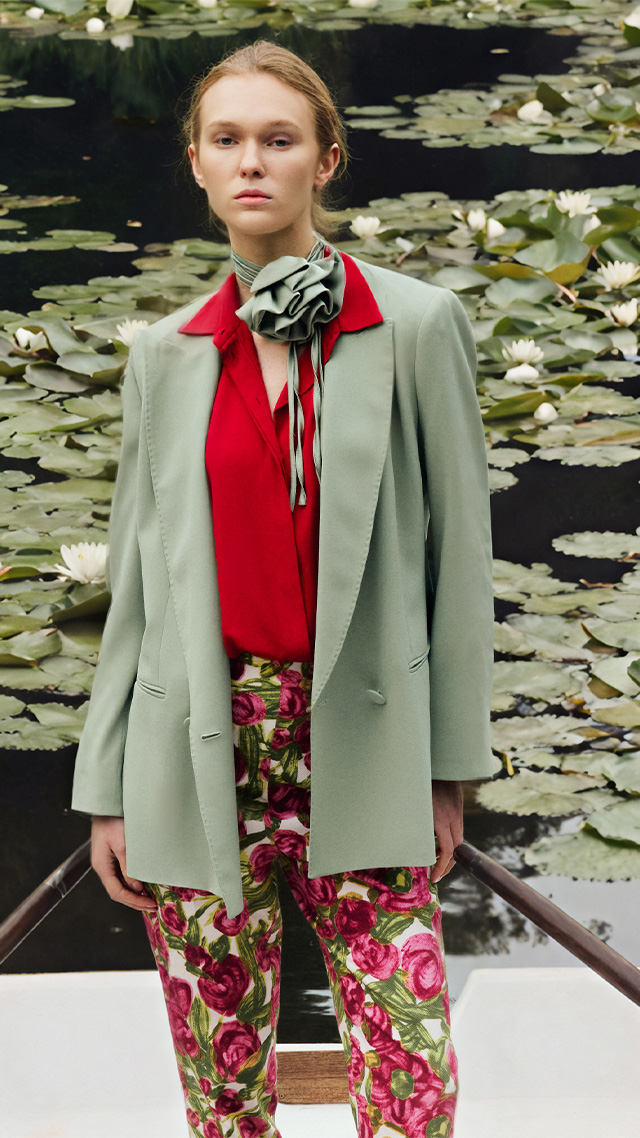 The new season is defined through a bold colour language. It’s not about decoration, but a visual architecture where macro botanical prints dialogue with primary hues. Crimson red is set against silk, while sculptural floral patterns redefine the volumes of trench coats and trousers. An intentional aesthetic, where pigment shapes the identity of the silhouette.