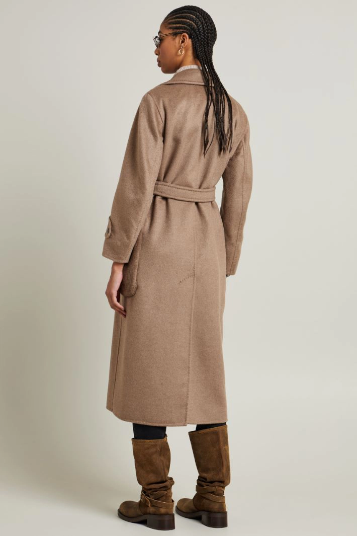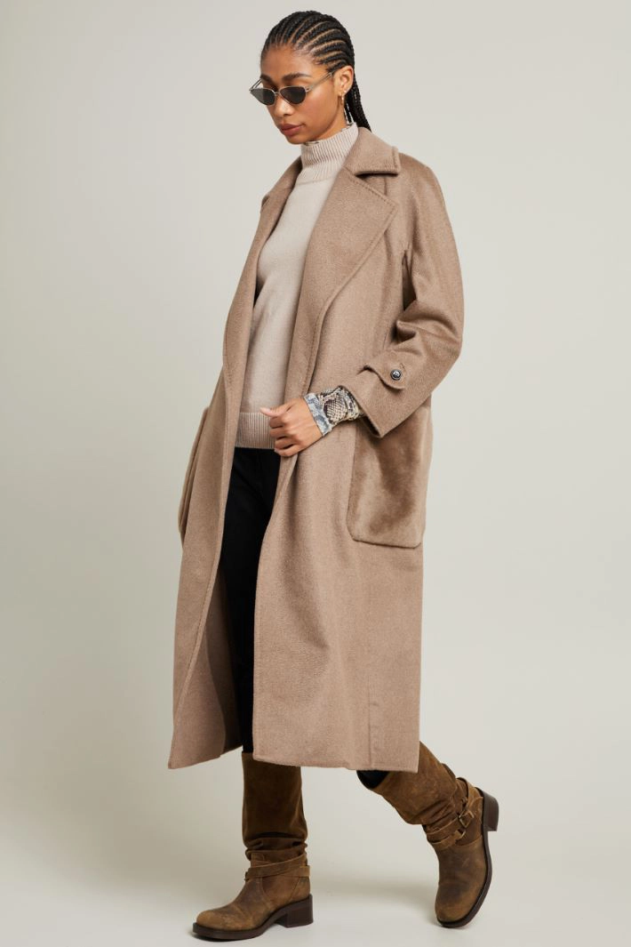Long dressing coat in double drap in pure sable cashmere, with tonal stitching lapel collar, long kimono sleeves with straps, maxi patch pockets in sheepskin and central slit on the back. Fastening with a matching belt. Unlined.
