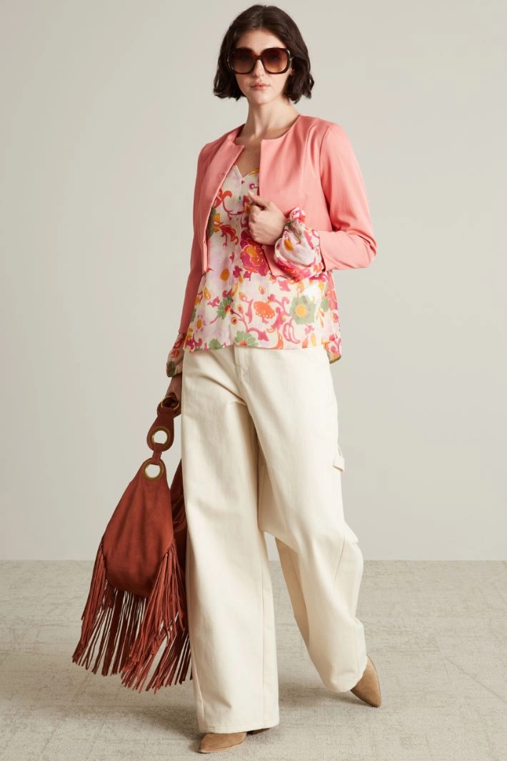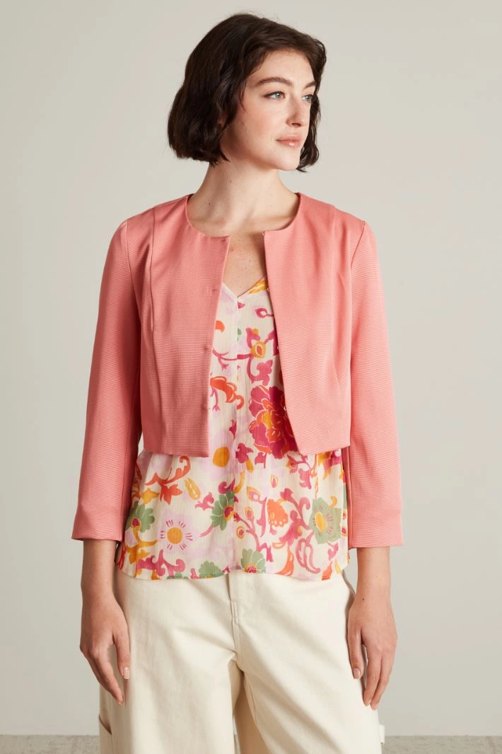 Straight-cut bolero in stretch cotton blend faille, with round neckline and three-quarter sleeves. Hook fastening. Unlined.