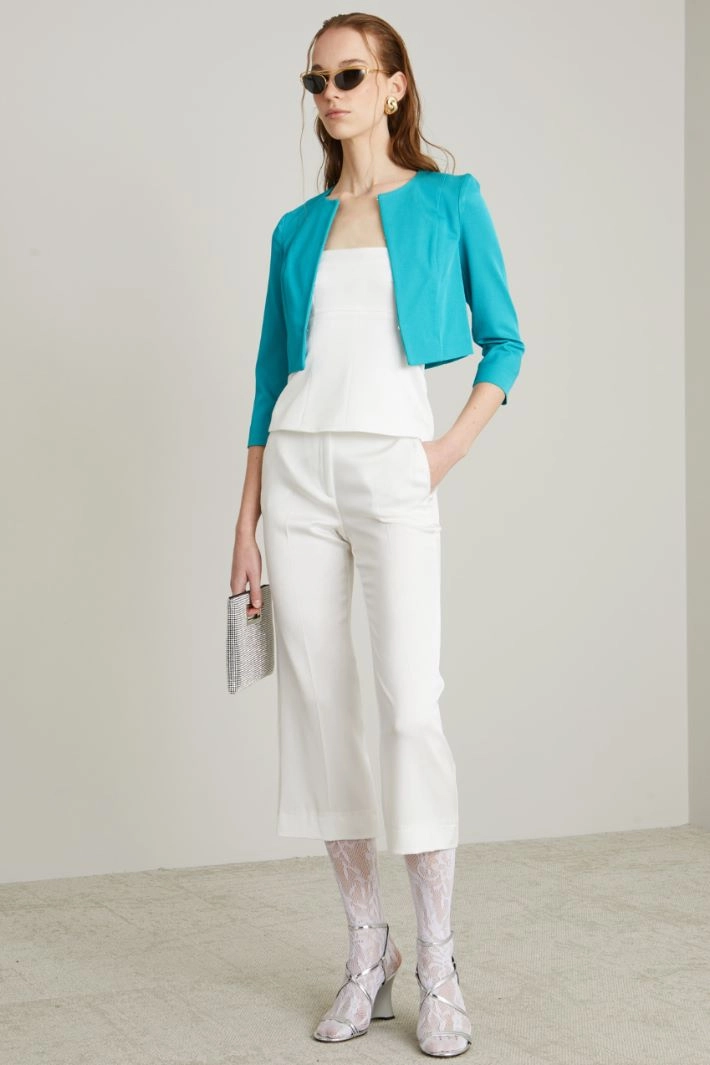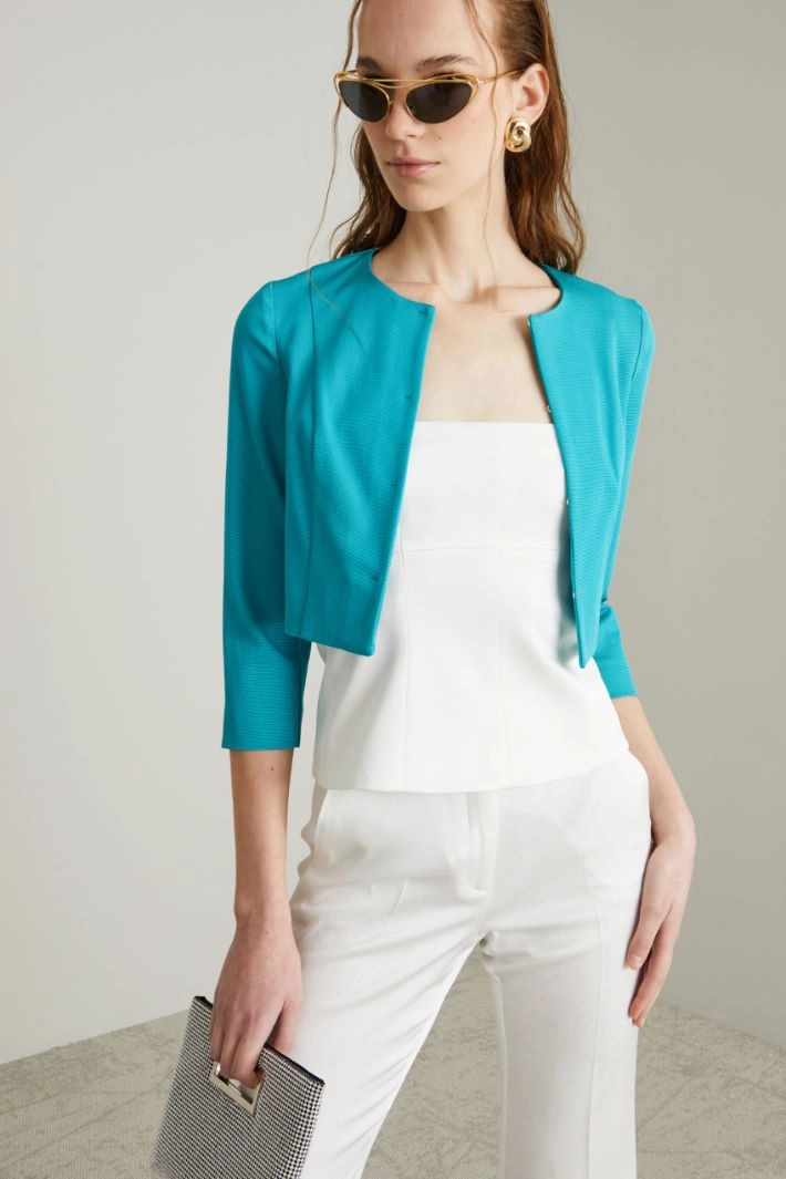 Straight-cut bolero in stretch cotton blend faille, with round neckline and three-quarter sleeves. Hook fastening. Unlined.