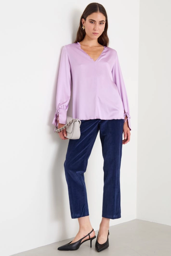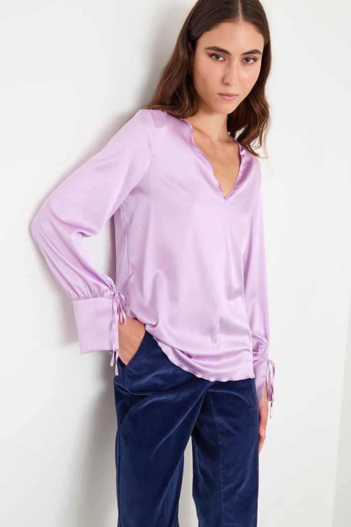 Straight-cut blouse in stretch silk satin, with a V-neck and long sleeves with cuffs and laces to tie.