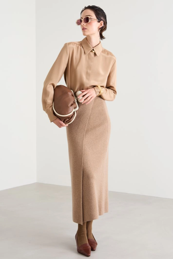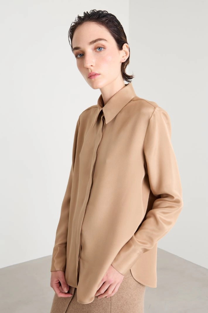 Camisa de corte recto de crepé de china de pura seda, con cuello clásico, mangas largas pegadas con puño alto y doble botón joya. Bajo redondeado con aberturas laterales. Cierre con botones ocultos.