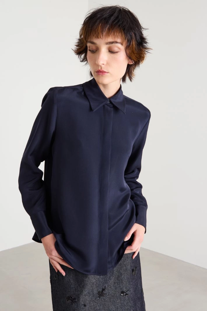 Camisa de corte recto de crepé de china de pura seda, con cuello clásico, mangas largas pegadas con puño alto y doble botón joya. Bajo redondeado con aberturas laterales. Cierre con botones ocultos.