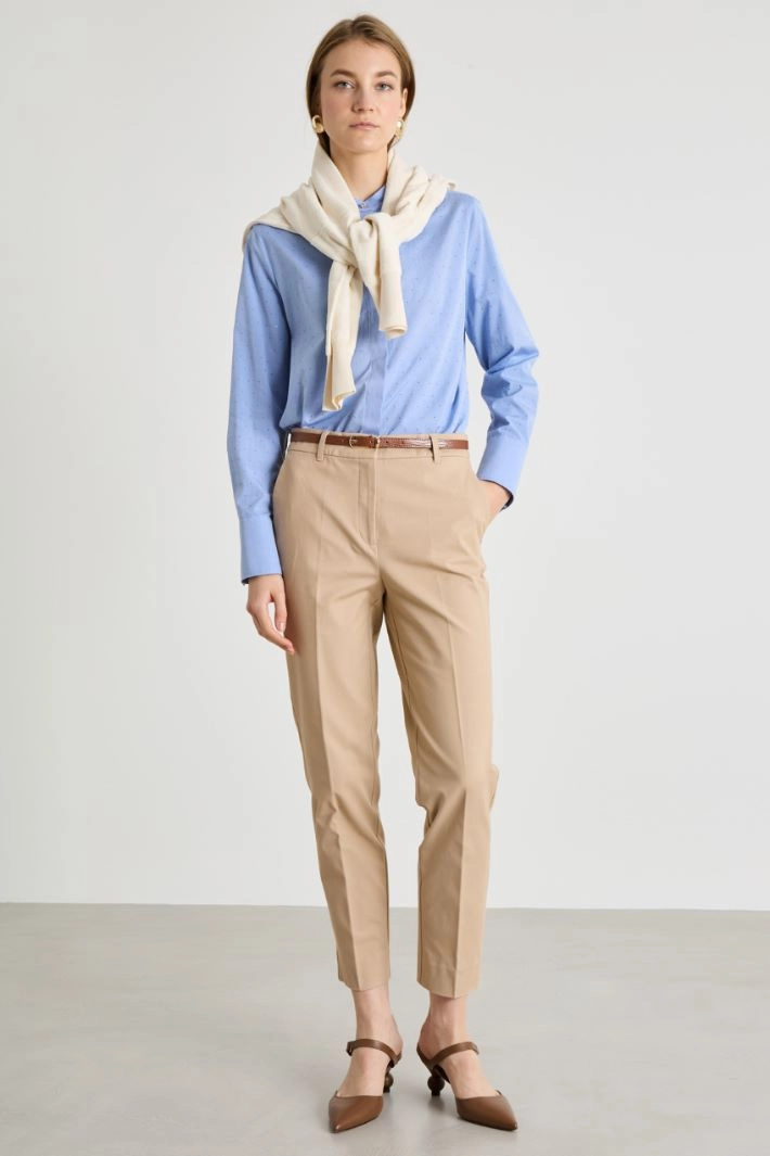 Cigarette trousers in stretch cotton twill, with belt loops, front French pockets and welt pockets on the back. Concealed hook and zip fastening.
