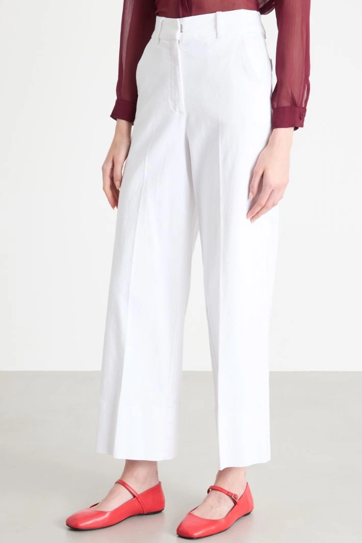 Straight-fit trousers crafted from stretch cotton bull denim, featuring belt loops, French pockets on the front and patch pockets on the back. Fastening with a button and concealed zip.