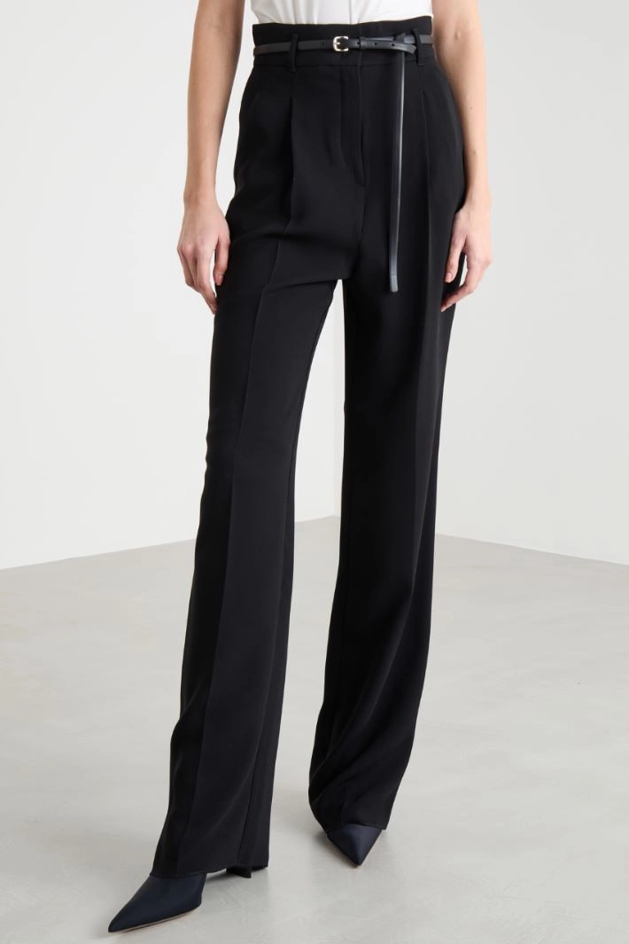 Straight-fit trousers crafted in cady, with a high waist, stitched leg creases and French pockets. Fastening with a concealed zip, button and hooks and a matching belt.