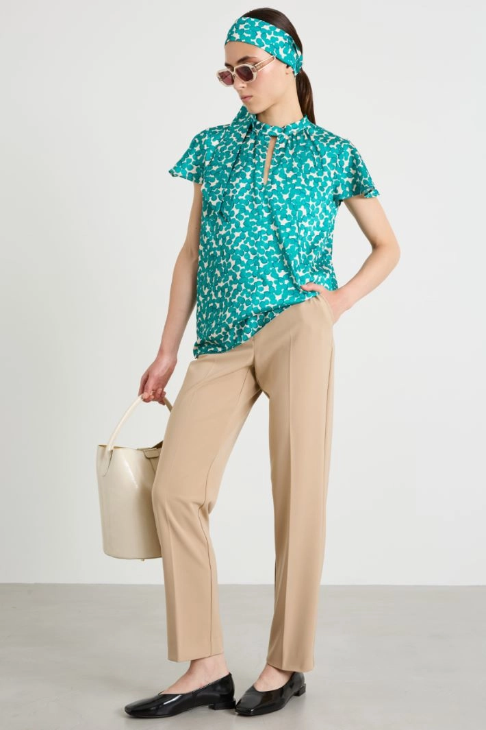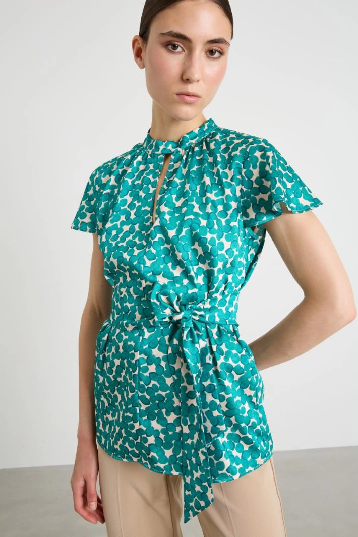 Straight-cut blouse in printed twill, with a stand-up collar, a teardrop opening on the front and a V-shaped opening on the back, and butterfly sleeves. Button fastening on the back of the collar. Matching belt.