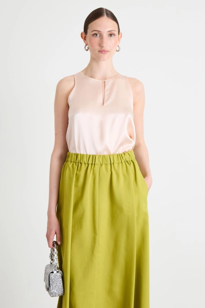 Straight-cut top in printed pure silk satin, with crew neckline, cut-out detail on the chest and keyhole fastening with button on the back.