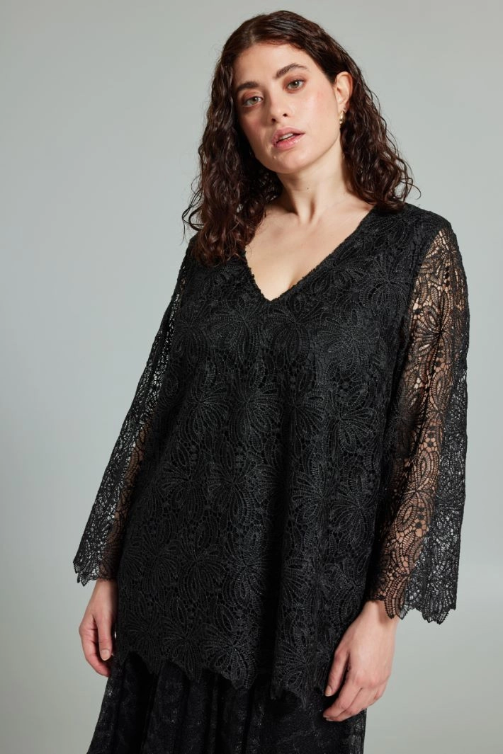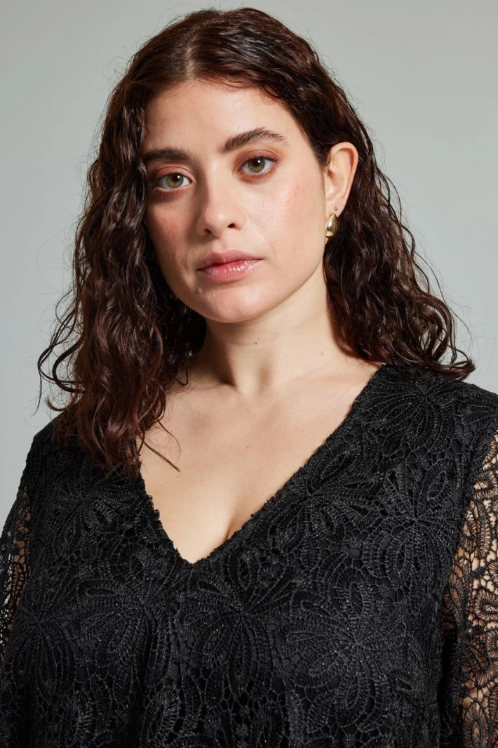 Straight cut top in lamé lace with satin inserts, V-neck and three-quarter sleeves. Partially lined.