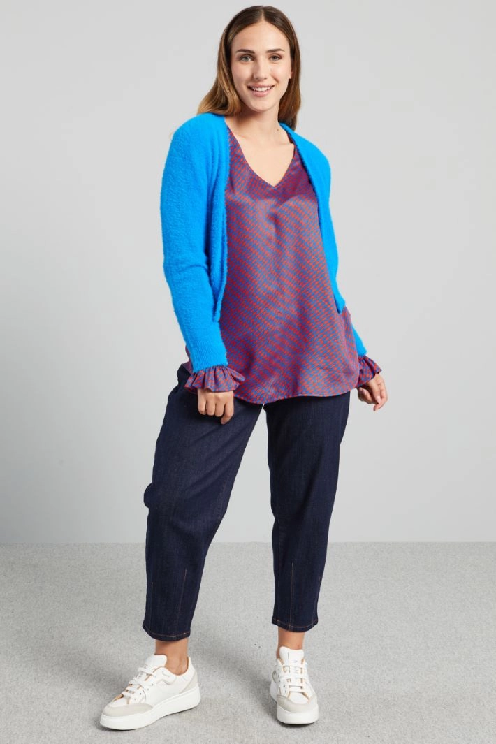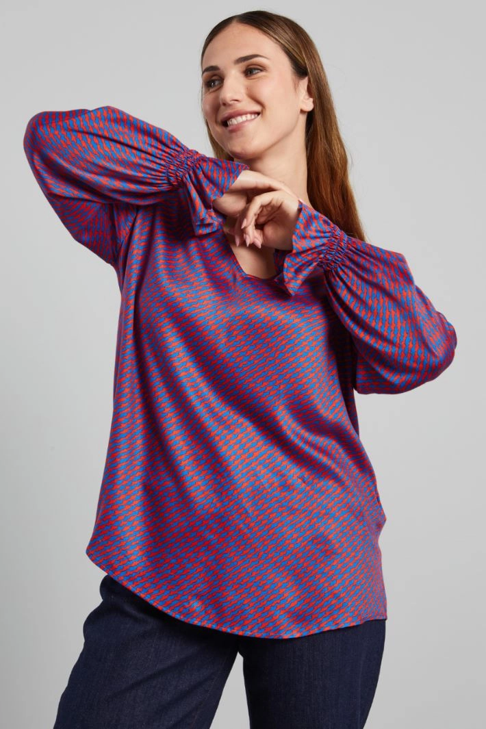 Flowy top in printed pure viscose fabric, with V-neck, long sleeves with elastic gathering at the wrist.
