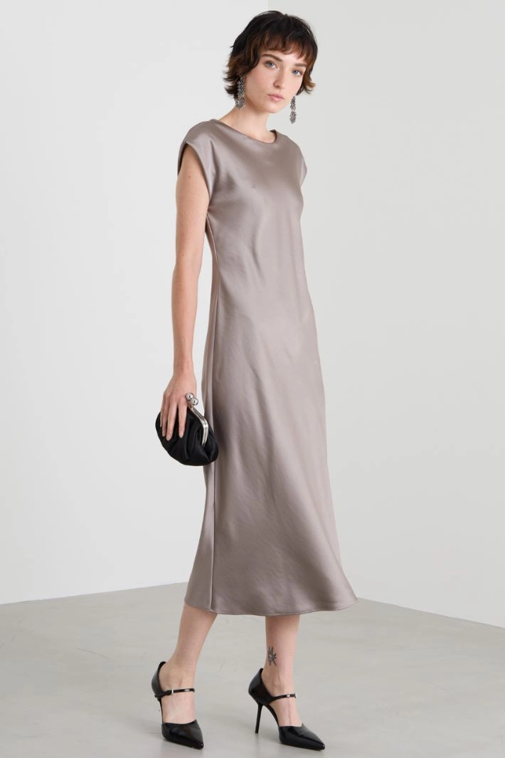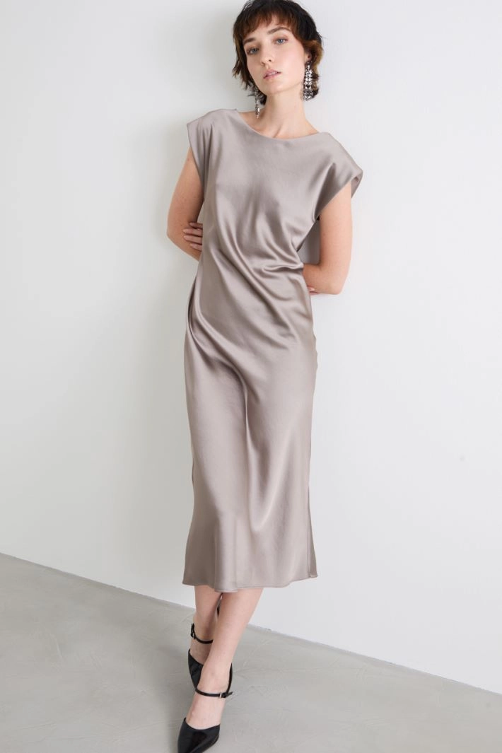 Loose-fit satin dress with a boat neckline on the front and a V-neck on the back, short sleeves with covered shoulders. Partially lined.
