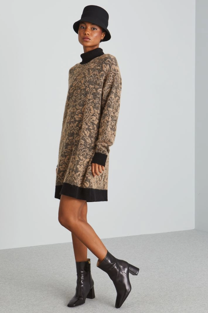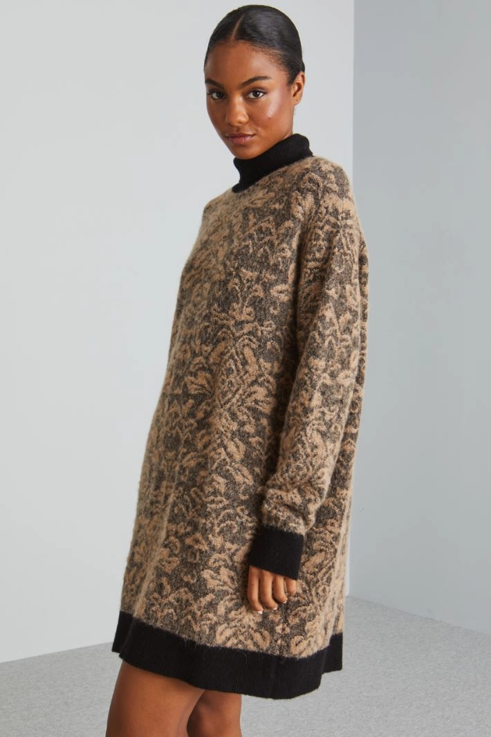 Short, loose-fit dress in stretch jacquard wool and alpaca blend, with a crater neck, long dropped sleeves and ribbed trims.