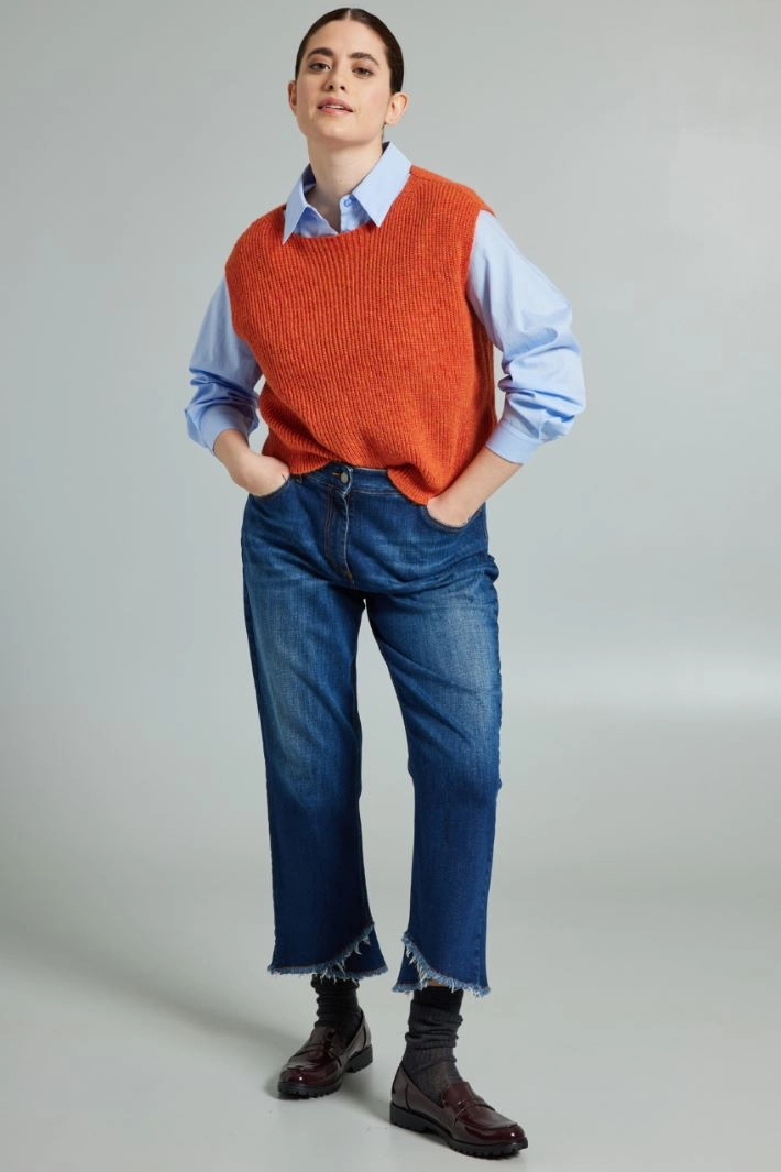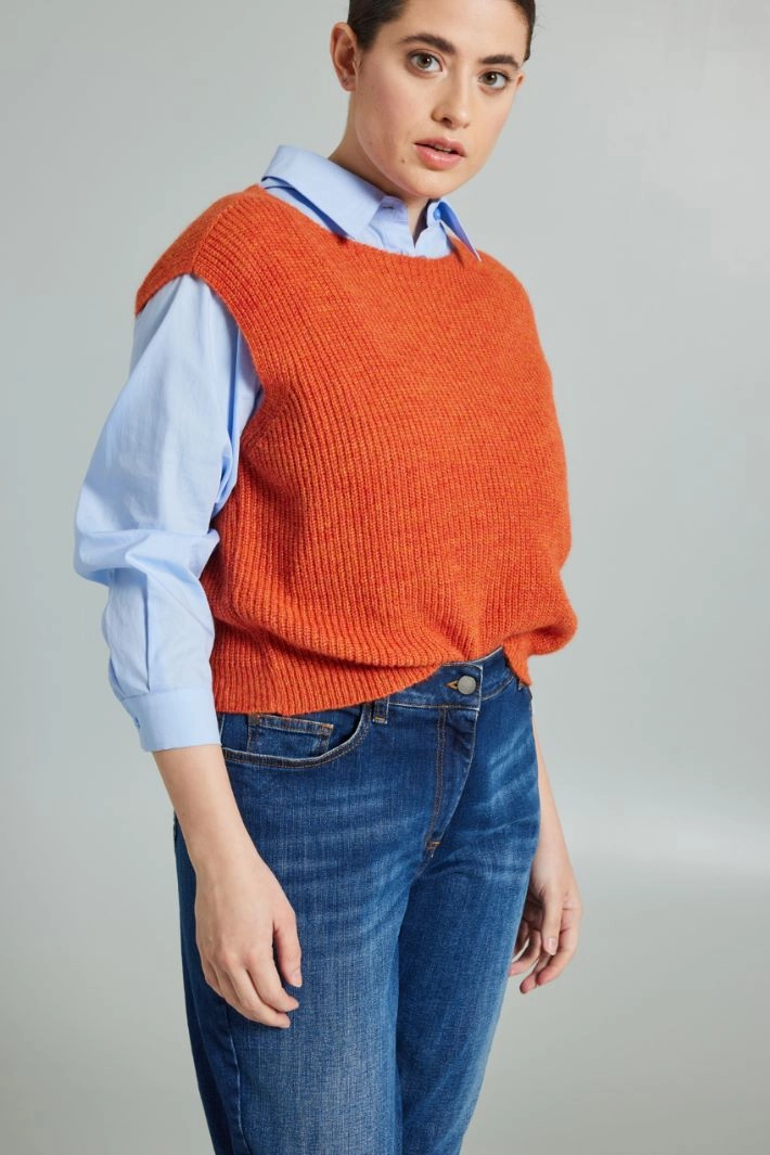 Short sleeveless gilet with a straight cut in viscose and wool blend yarn, with ribbed knit.