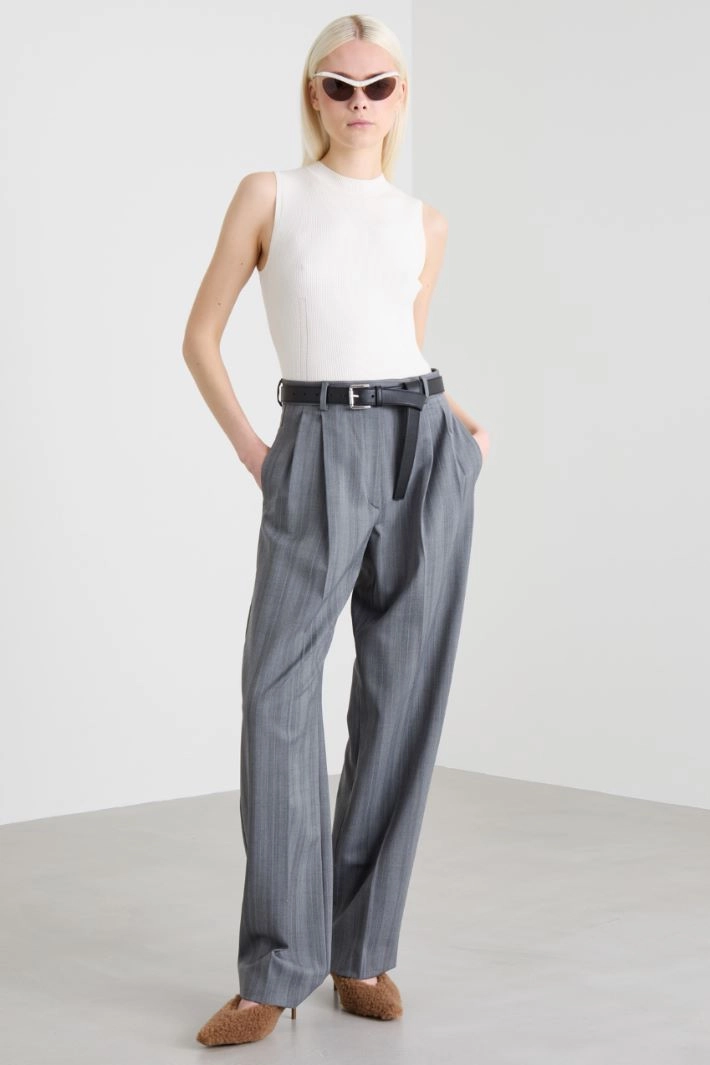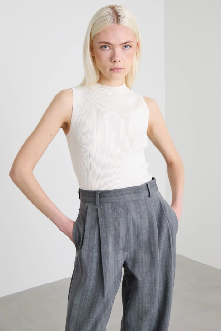 Fitted crop top in viscose blend yarn with ribbed knit and high neck.