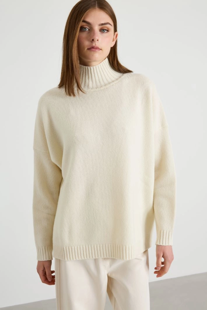 Oversized sweater in pure wool yarn, with a crater neck, long sleeves with dropped shoulders and ribbed trim.
