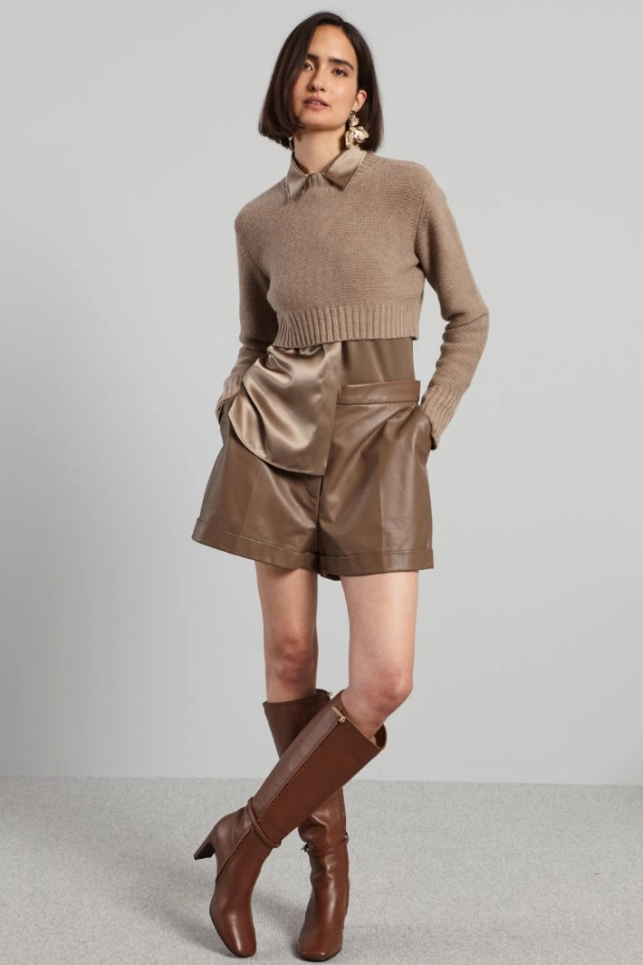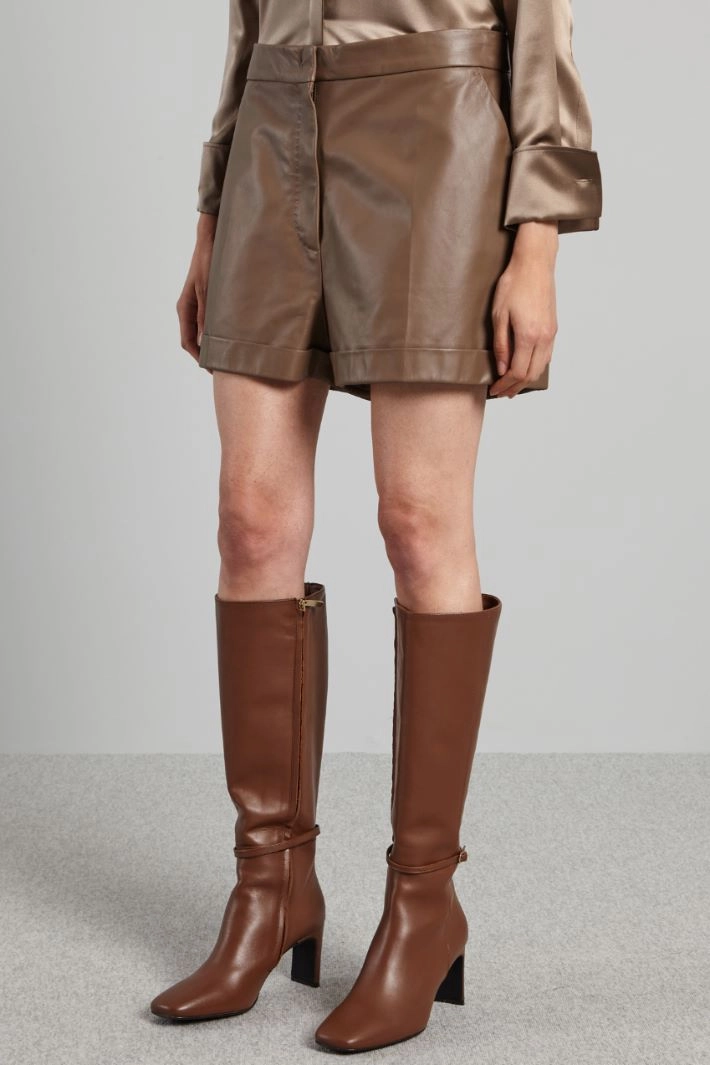 Straight-cut shorts in real nappa leather, with side French pockets, turn-up hem, stitched finish and hidden fastening with zip, button and hooks. Lined garment.