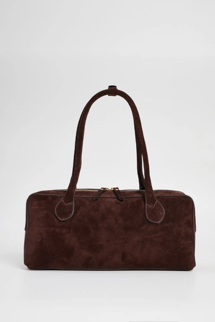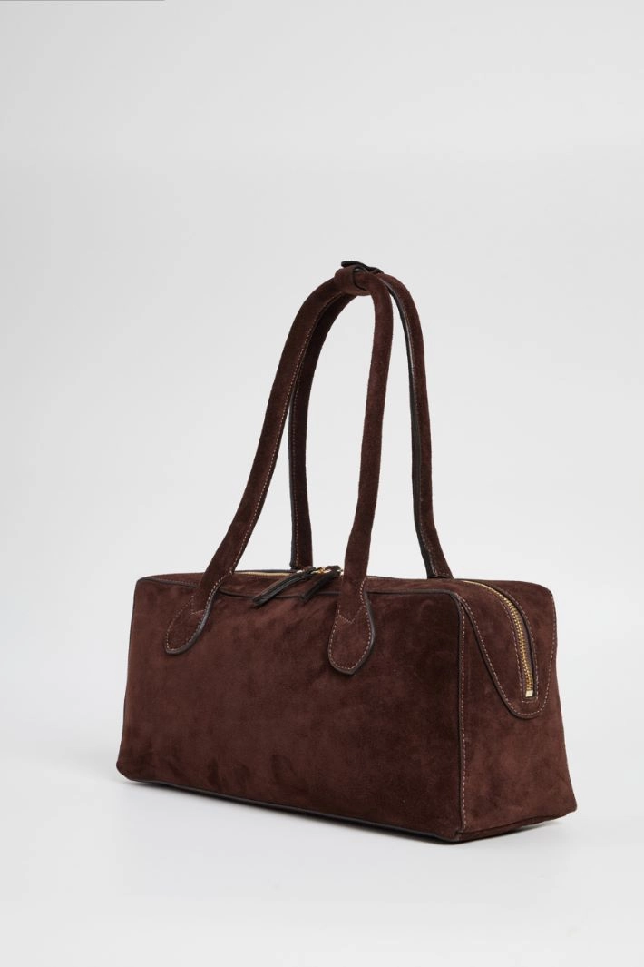 Bag in genuine suede effect leather with double handle and internal pockets. Zip closure