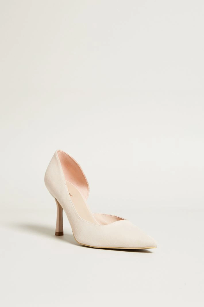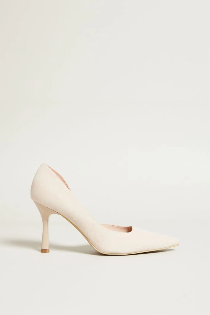 Suede pumps with internal opening detail, shiny heel. Rubber sole.