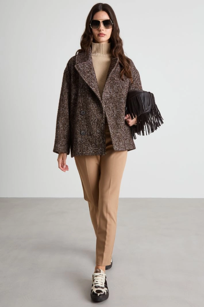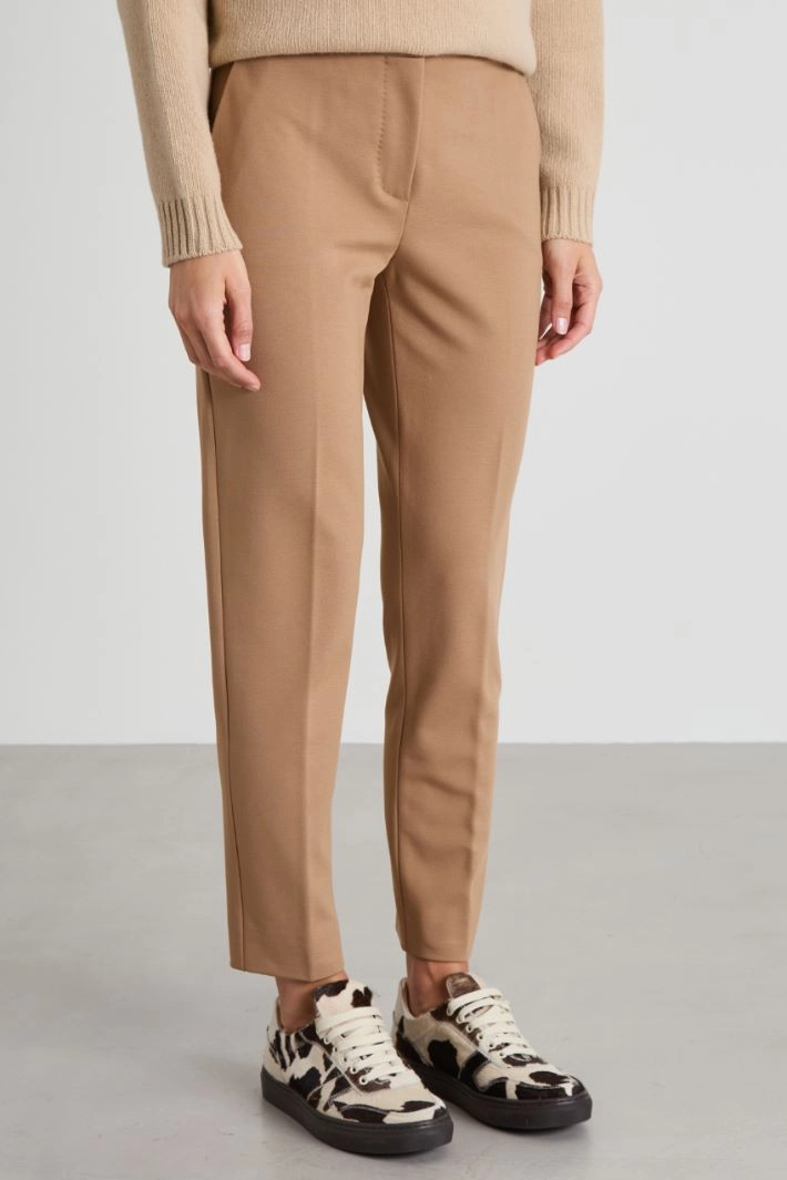 Semi-fitted trousers in viscose blend jersey, with French pockets on the front and crease ironed along the length. Concealed fastening with zip, button and hooks.