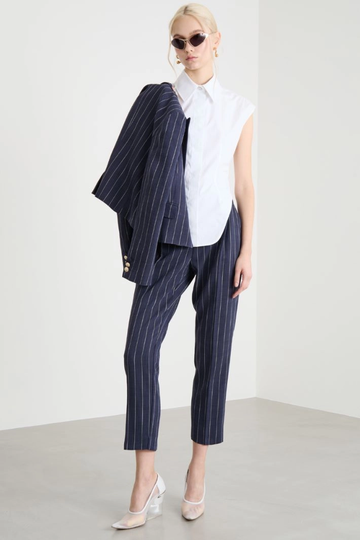 Fitted shirt in compact pure cotton canvas, with a pointed collar, deep front darts, a rounded hem and a horizontal cut-out at the back. Concealed front button fastening.
