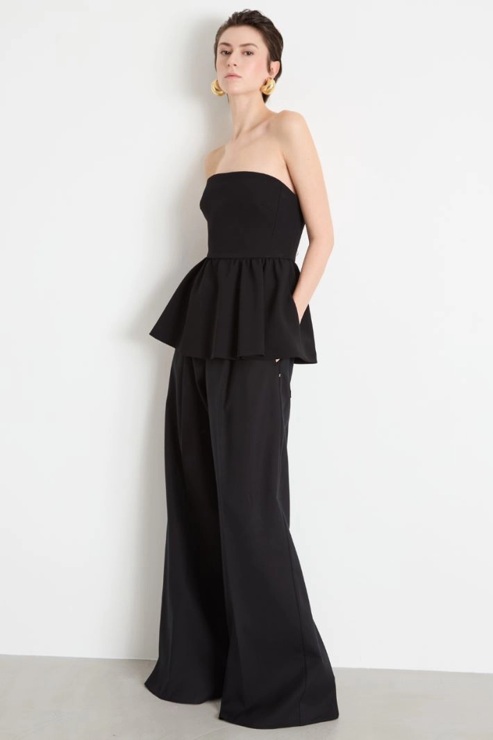 Palazzo trousers in cotton and viscose double cady, featuring belt loops, pleats, a pressed crease and French pockets on the front, and patch pockets on the back. Fastening with a zip, button and hook.