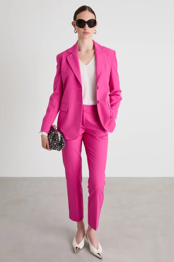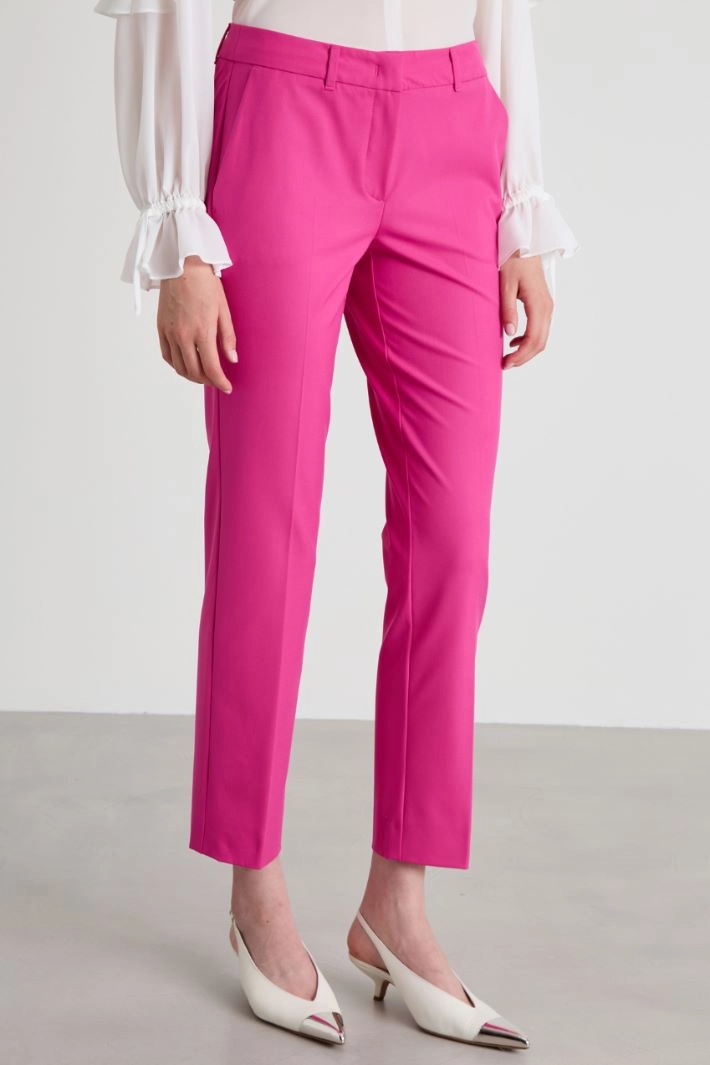 Cigarette trousers in stretch canvas, with belt loops at the waist, French pockets at the front, welt pockets at the back and crease ironed along the length. Hidden fastening with zip, button and hook.