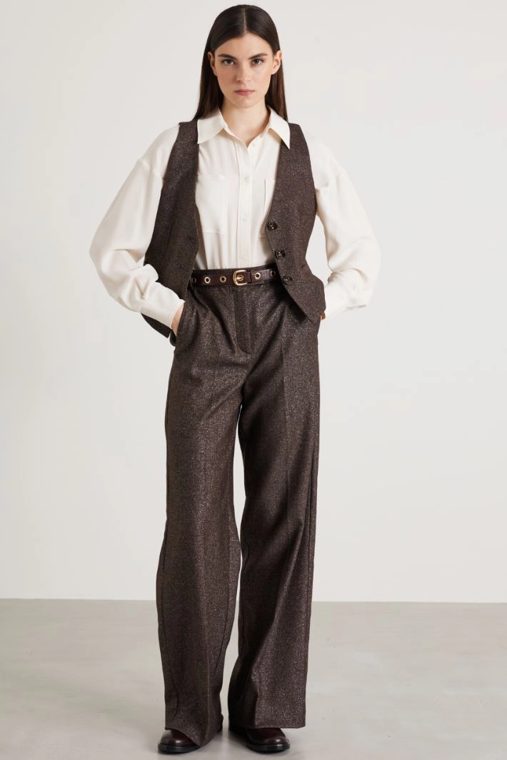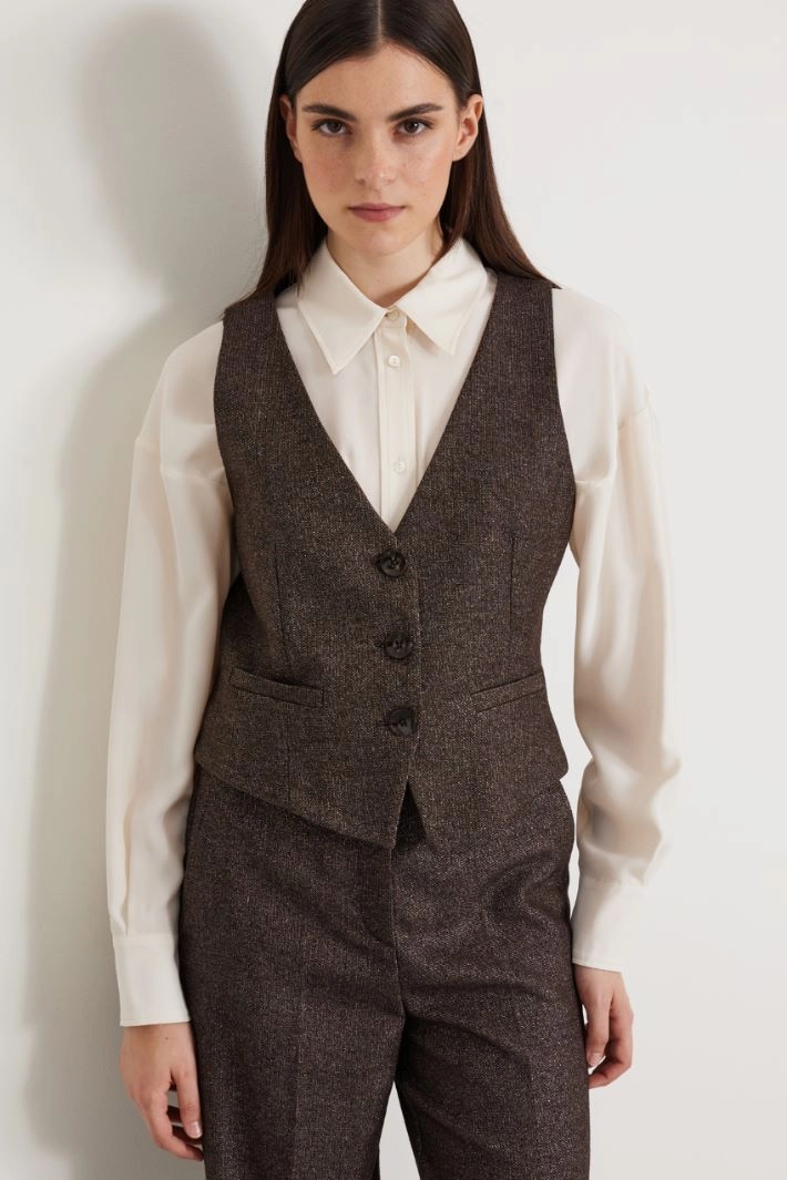 Semi-fitted gilet in wool blend fabric with lamé fiber inserts, V-neck and welt pockets. Button fastening. Lined.