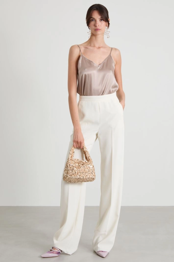Flowing lingerie top in silk blend satin, with V-neck and adjustable thin straps.