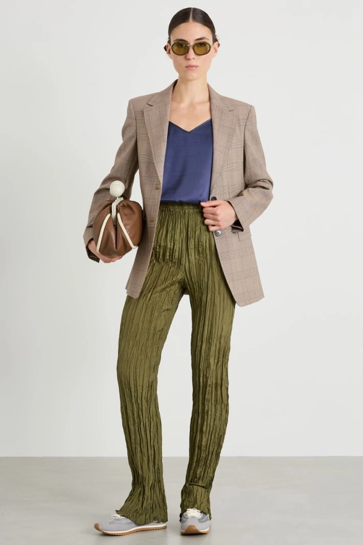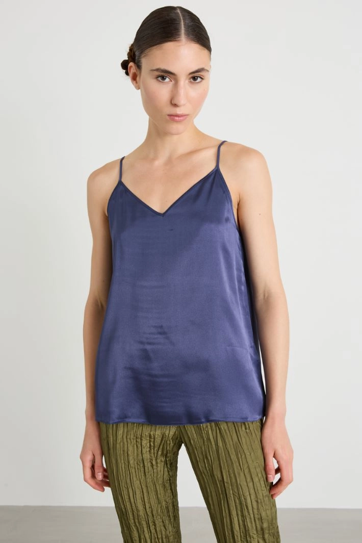 Flowing lingerie top in silk blend satin, with V-neck and adjustable thin straps.