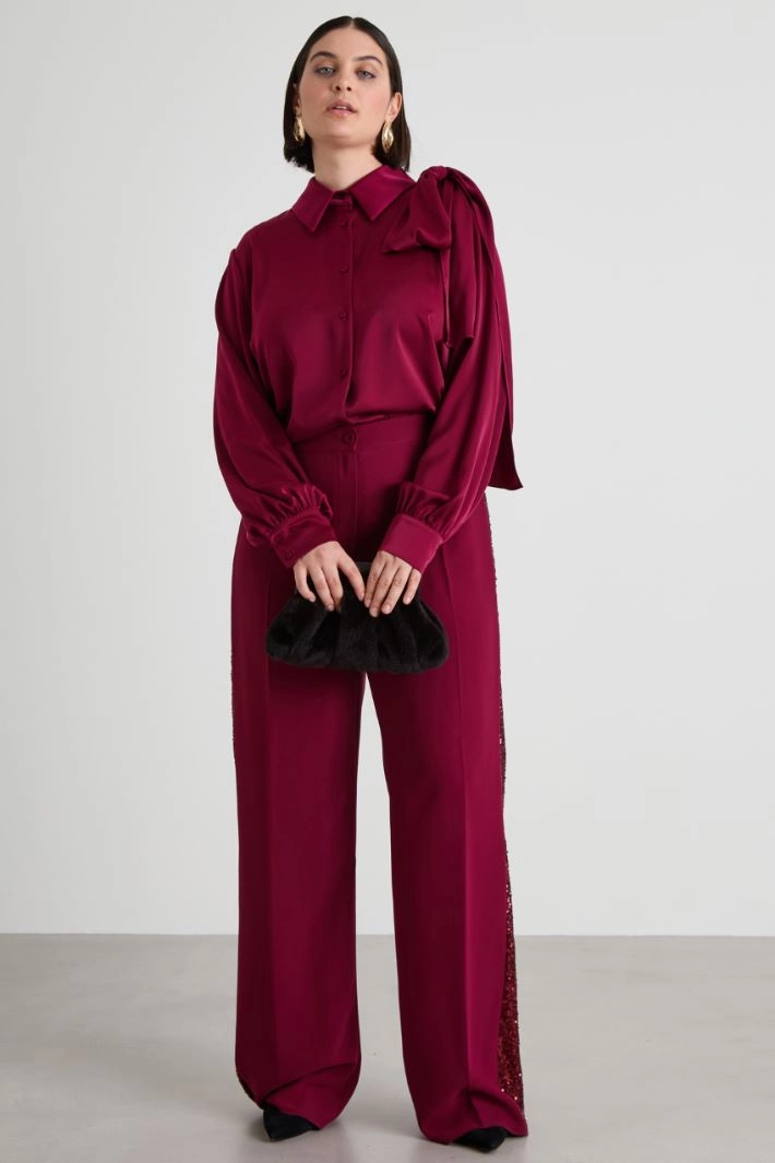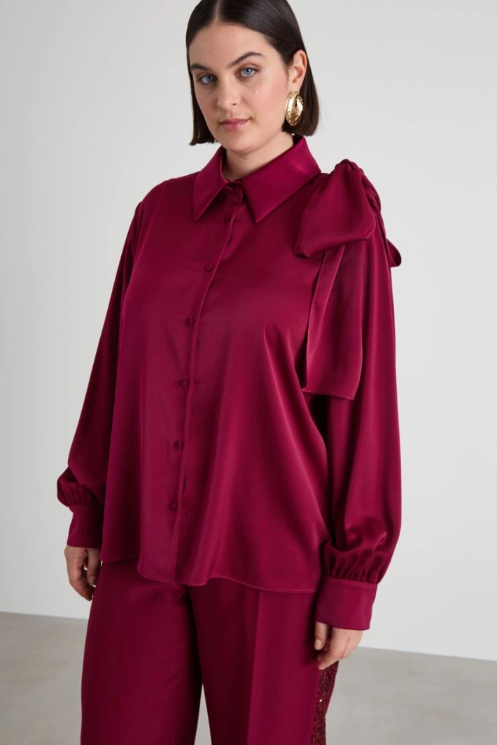 Flowing satin blouse with classic collar, long sleeves with cuff and buttons and removable sash to tie on one shoulder. Visible fastening with covered buttons.