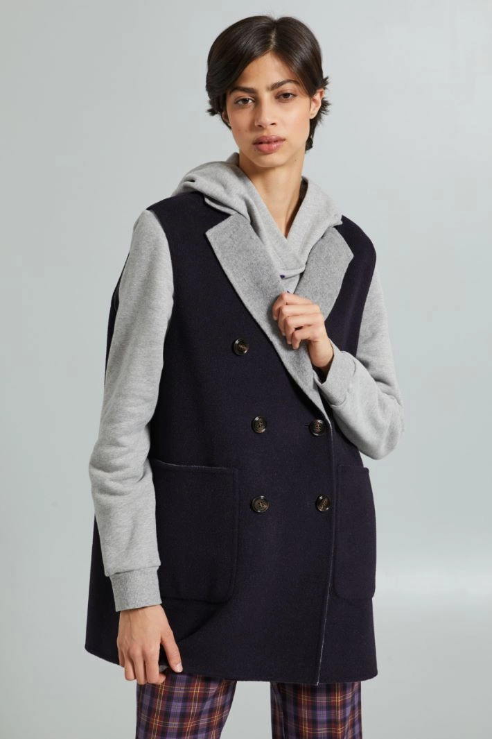 Straight-cut gilet in double wool cloth, lapel collar, sleeveless, side patch pockets and double-breasted button fastening. Reversible.
