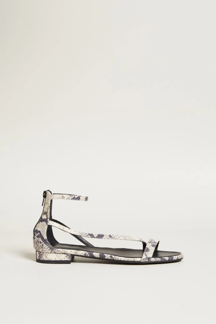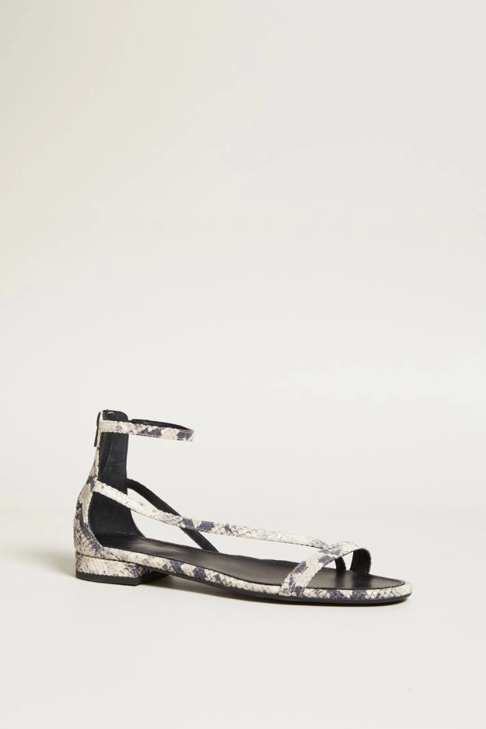 Low sandals in genuine suede-effect printed leather, with straps and zip closure on the back. Nappa lining, rubber sole.