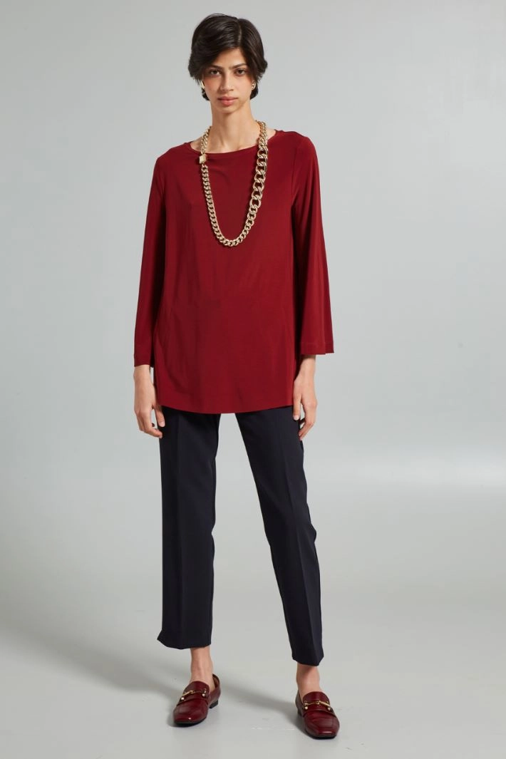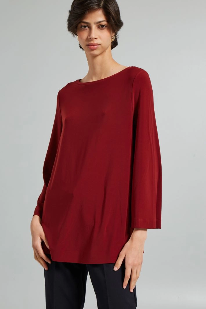 Flared blouse in technical stretch jersey, with boat neckline, and long sleeves.