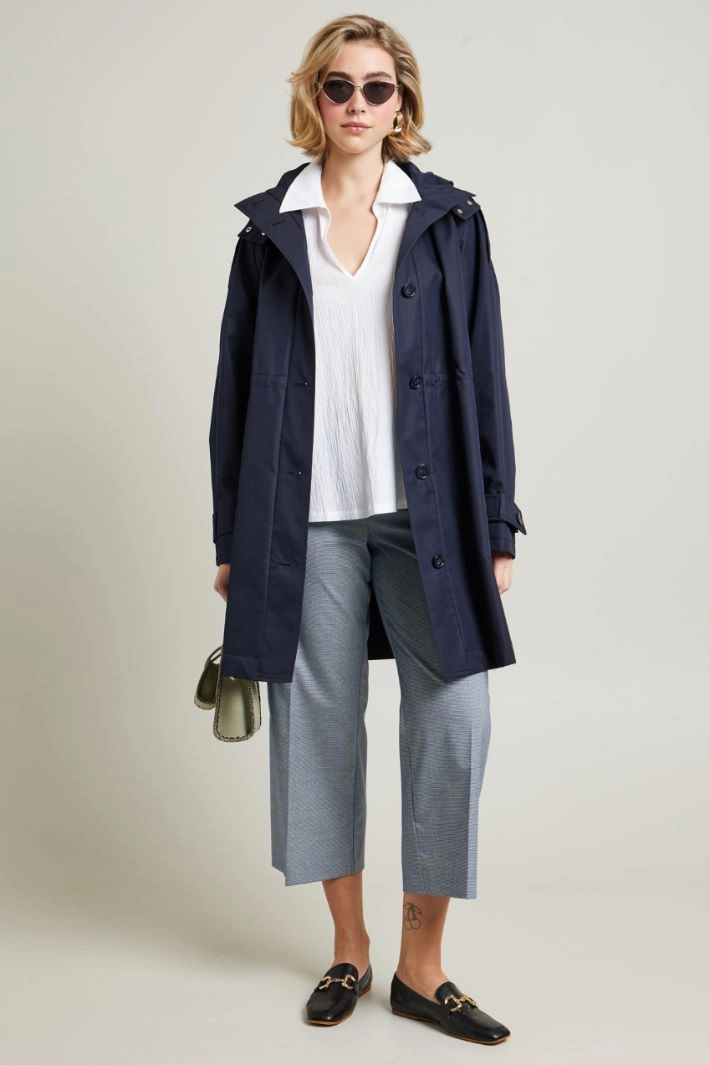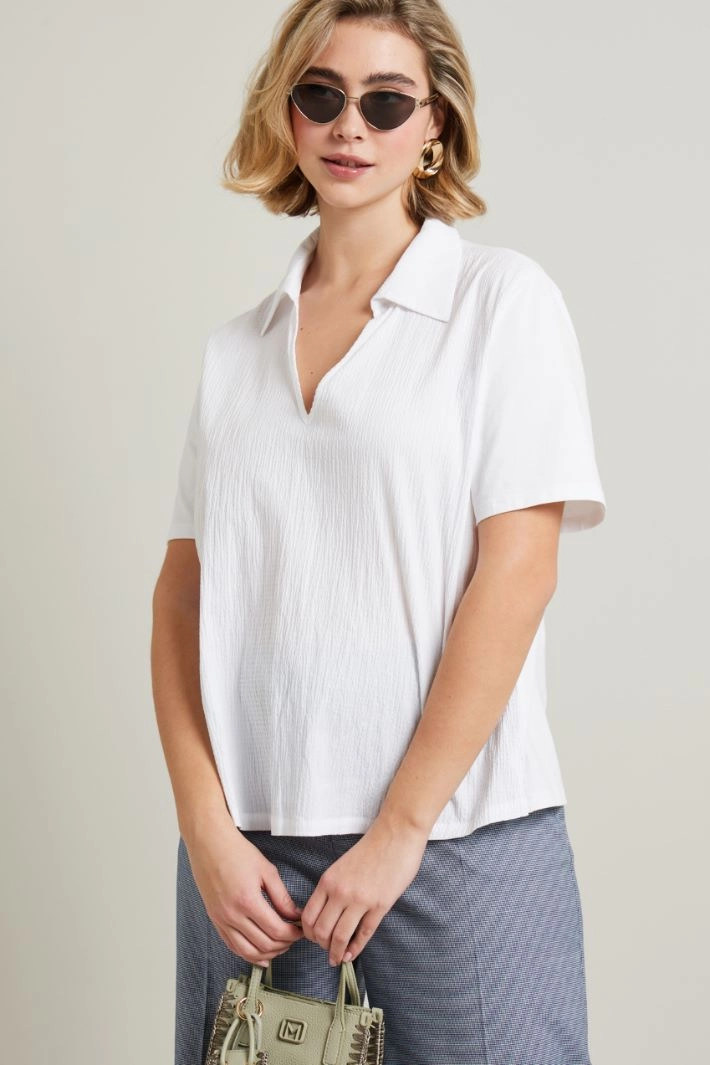 Flared T-shirt in stretch cotton jersey, with seersucker panel on the front, polo collar, short sleeves and side vents.