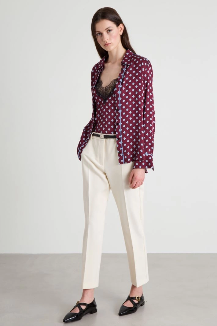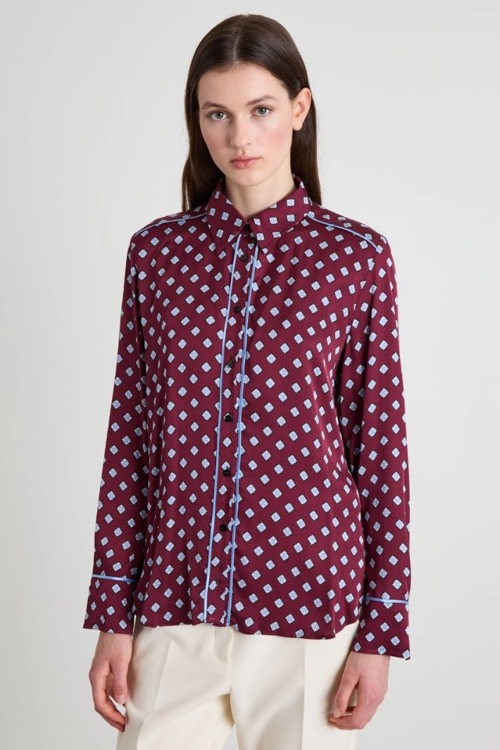 Straight-cut shirt in flowing viscose fabric, with a classic collar, long sleeves with buttoned cuffs, and a yoke with a counter-pleat motif on the back. Button fastening.