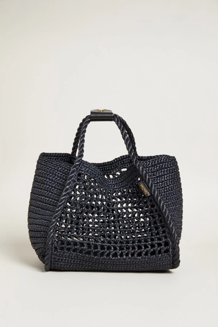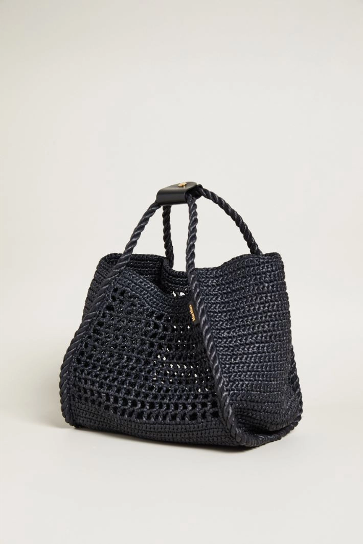 Handbag in pure viscose crochet with a raffia effect, with double handles and a leather strap with button. Without closure. Unlined interior.