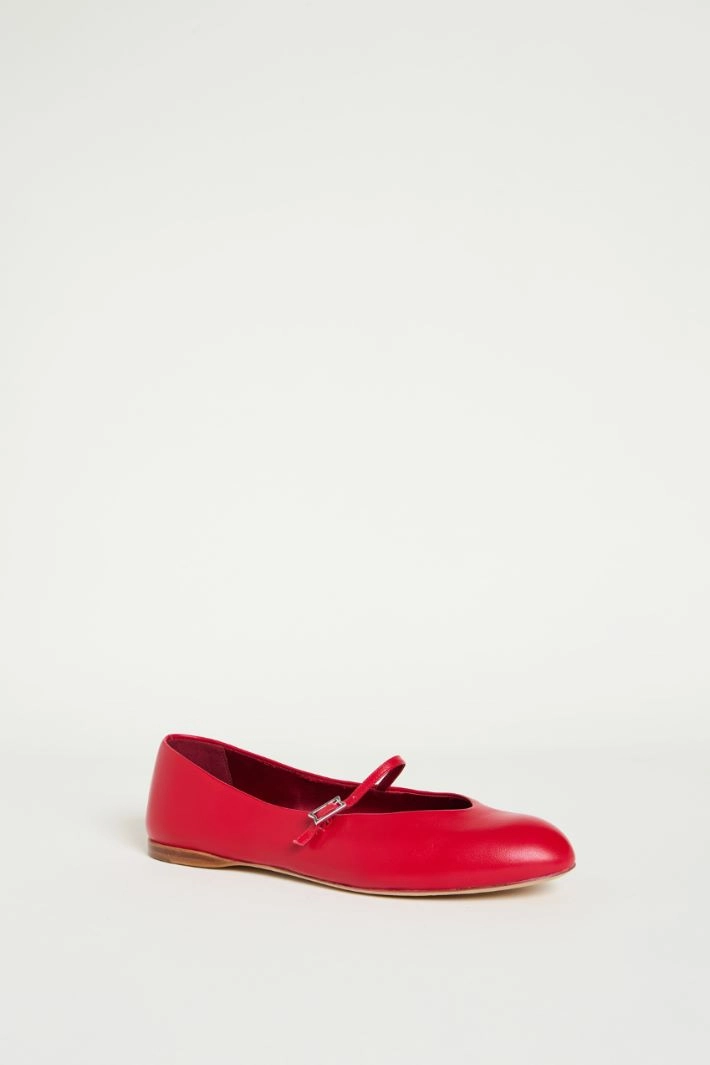 Ballet flats in soft, semi-lustrous leather, with a rounded toe, an almond-shaped topline and an instep strap with a side buckle. Silk satin lining. Leather sole.