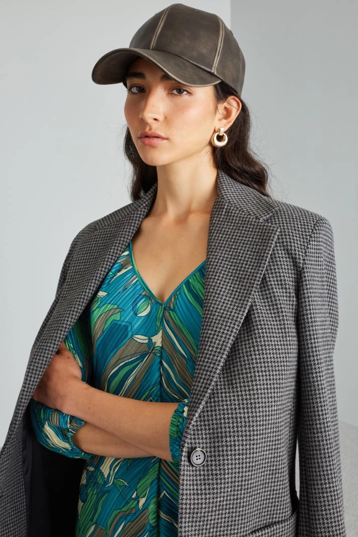 Cap with rigid visor in leather effect and hook fastening on the back.
