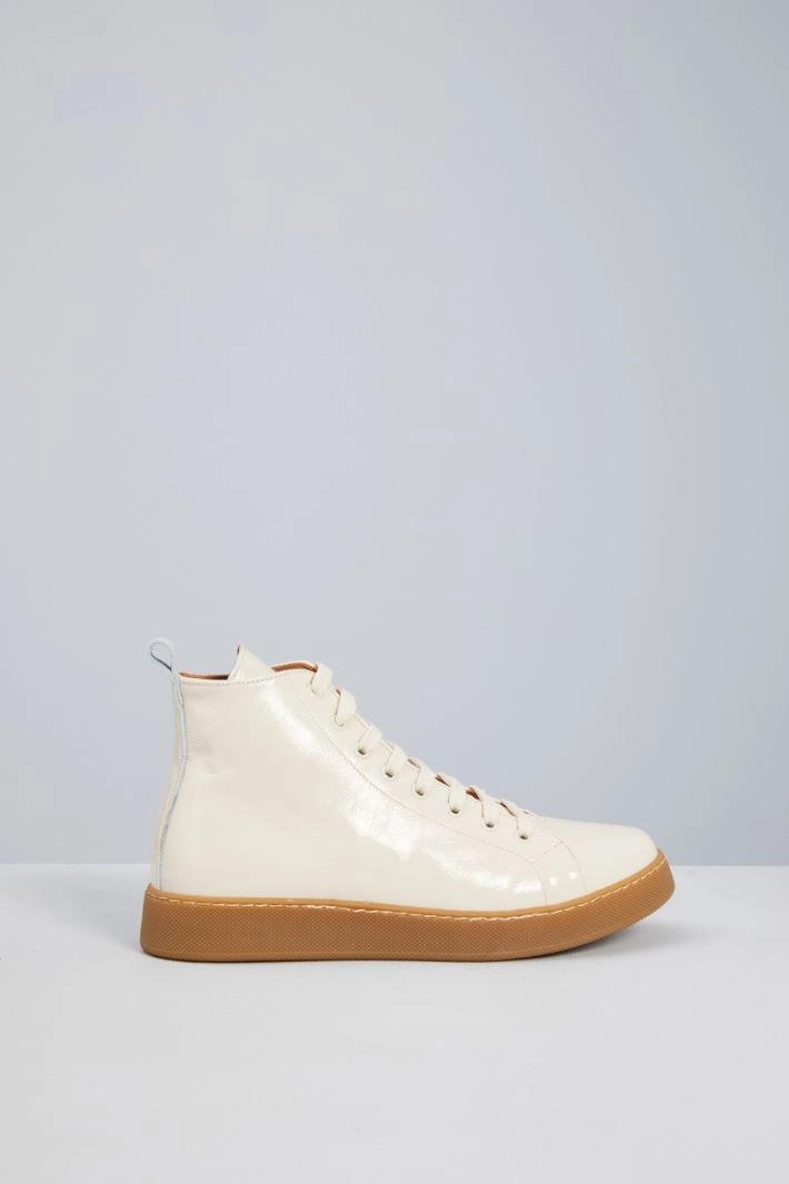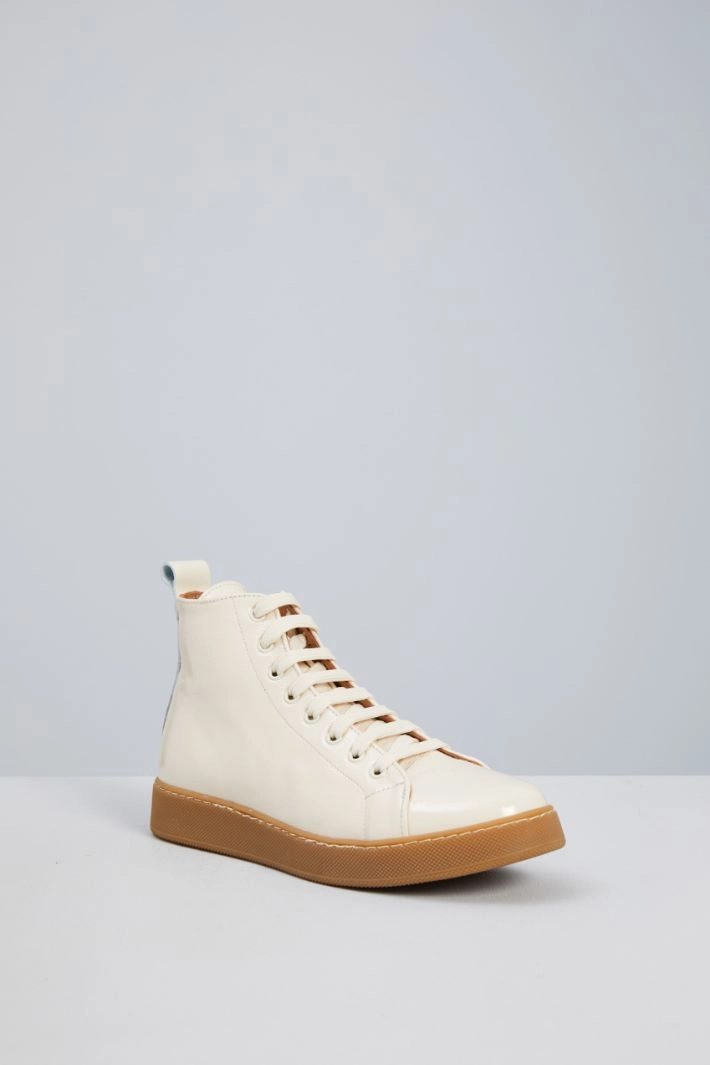 High sneakers in real patent leather, with lace closure. Leather lining, contrasting rubber sole.