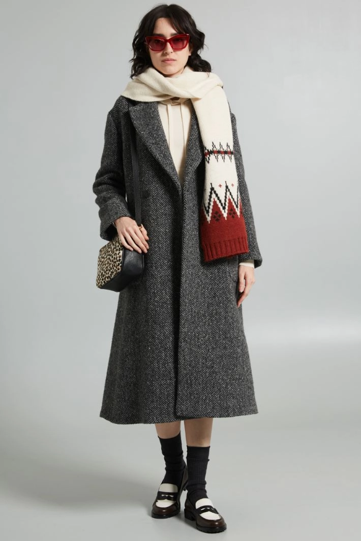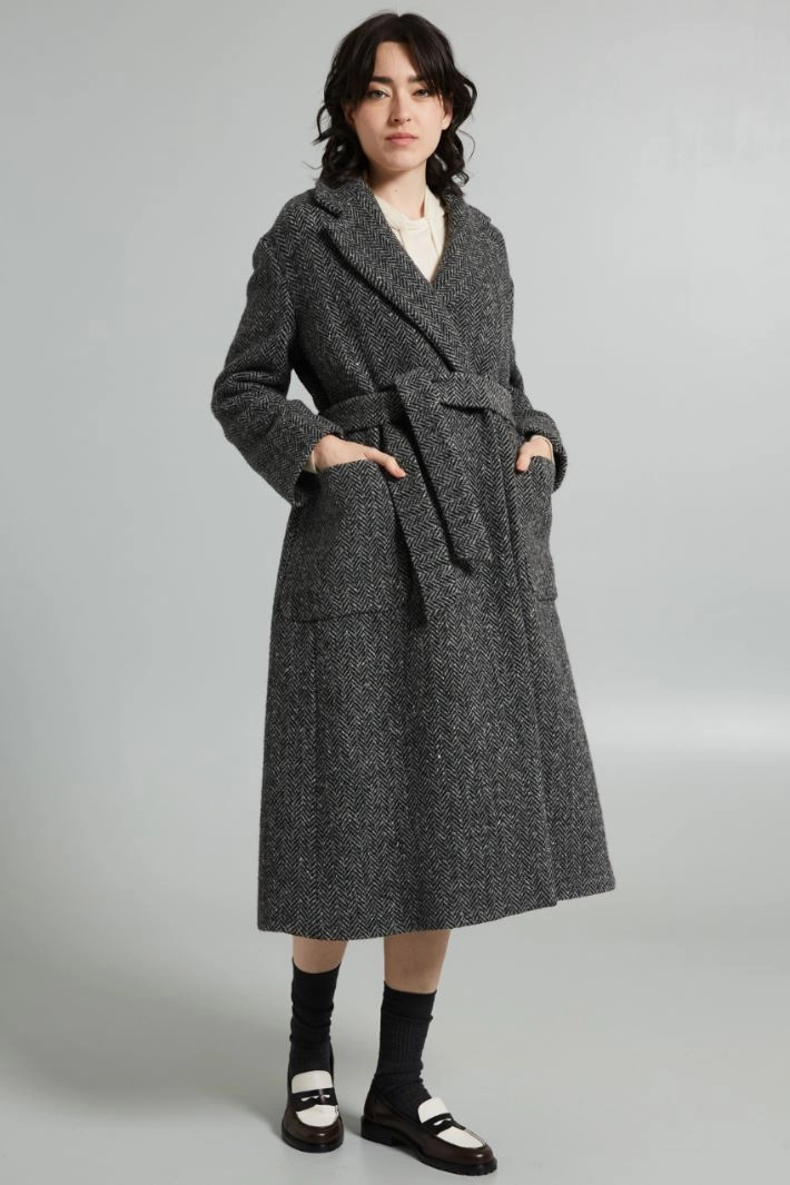 Long straight-cut coat in woven yarn-dyed wool blend herringbone fabric, with lapel collar, long sleeves, patch pockets. Slit in the back at the bottom. Double-breasted button fastening and matching belt. Lined.