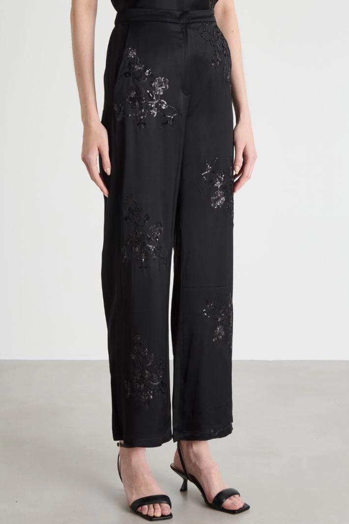 Wide-leg trousers crafted in sequin-embroidered viscose satin, with an elasticated waistband at the back and French pockets. Hook and zip fastening.