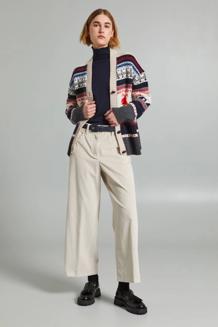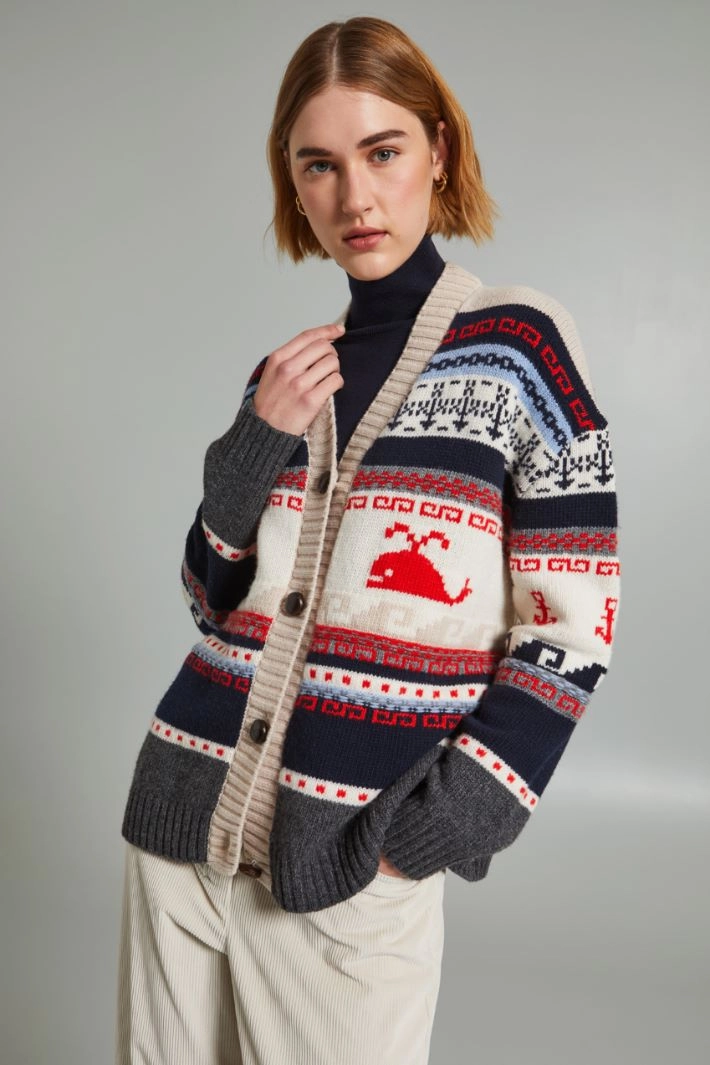 Oversized cardigan in wool blend yarn, with jacquard motif, V-neck, long sleeves with dropped shoulders and button fastening.