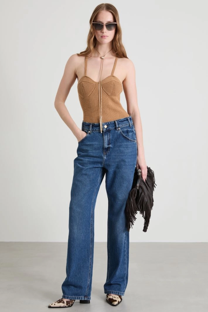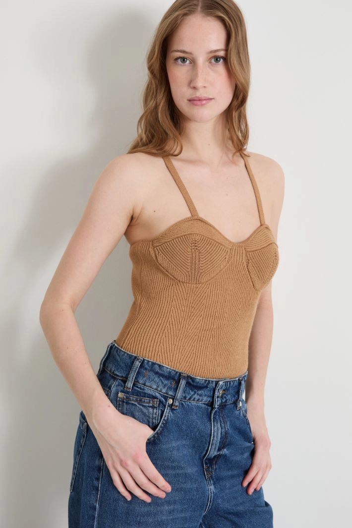 Body bustier in viscose blend knit with ribbing and thin shoulder straps. Fastening with press studs.