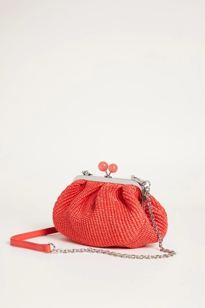 Raffia-effect clutch with a removable chain shoulder strap featuring a leather shoulder pad, a striped twill lining and an internal slip pocket. Fastening with a ball clasp.
