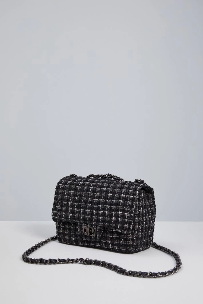Tweed bag with lamé insert, chain shoulder strap, faux leather lined interior with pocket and interlocking closure on the flap.