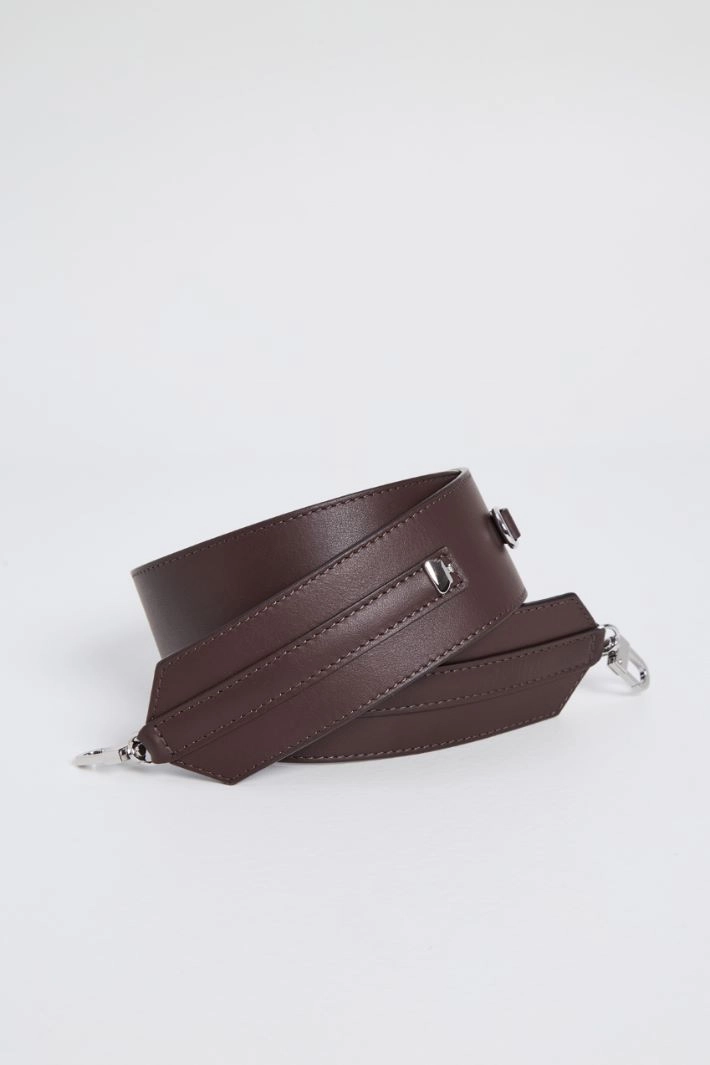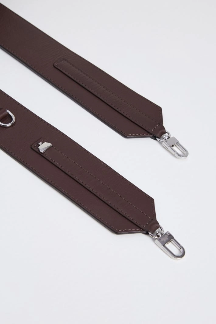Shoulder strap in smooth genuine leather, with metal rings along the length and small snap hooks at the end. Dimensions: 105x5x1 cm.