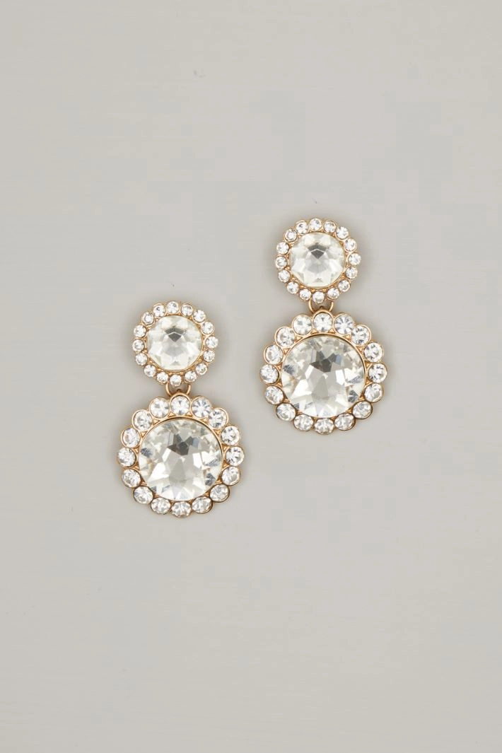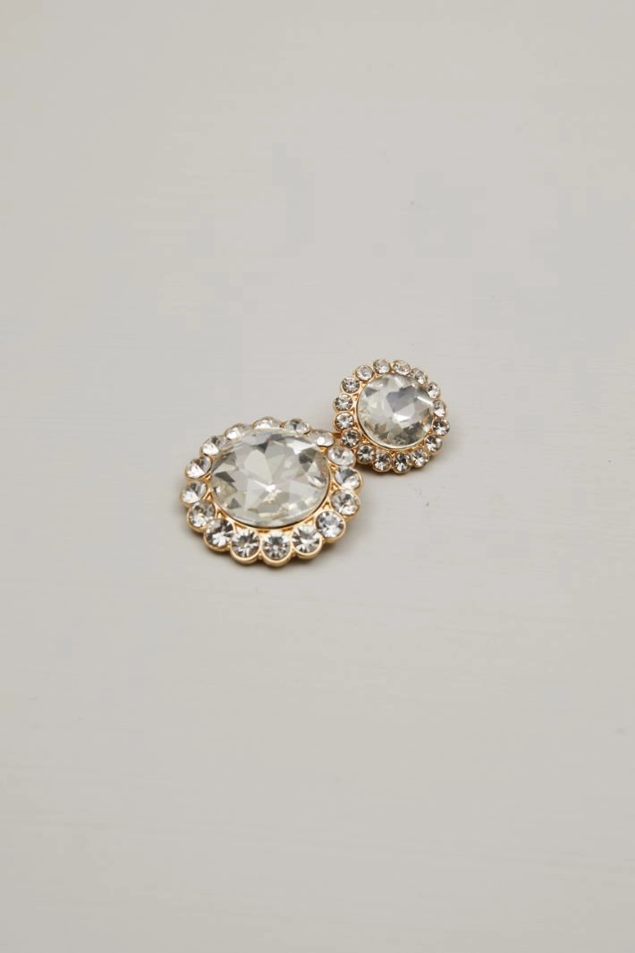 Asymmetrical double circle pendant earrings made of metal, with set rhinestones and butterfly closure.