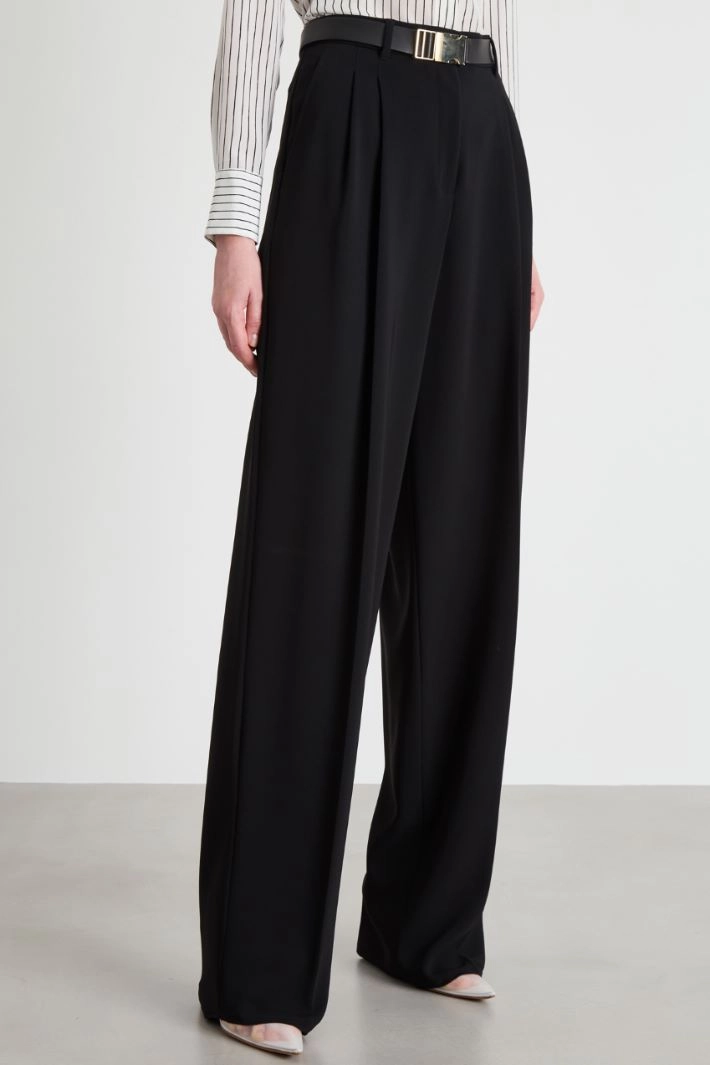 Carrot-fit cady trousers, with a pressed crease, belt loops, double front pleats and French pockets. Matching belt. Zip and hook fastening.