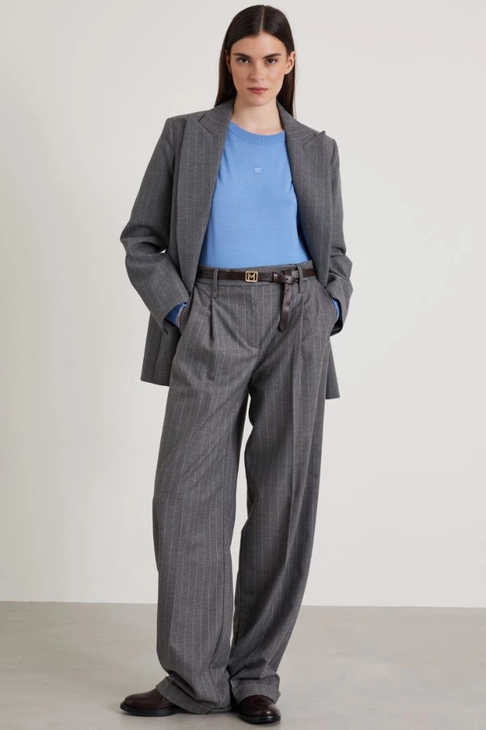 Loose-fitting trousers in yarn-dyed stretch viscose blend flannel, with belt loops, darts at the waist, side French pockets and buttoned welt pockets on the back, pressed crease lengthwise. Hem with turn-up and hidden fastening with zip, button and hooks.