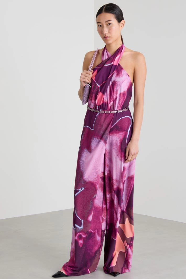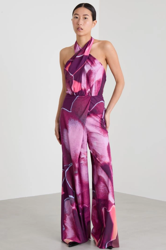 Flowing jumpsuit in printed stretch jersey, with a crossover halterneck, elastic waistband and palazzo pants with a diagonal panel. Invisible zip fastening and hook on the back.
